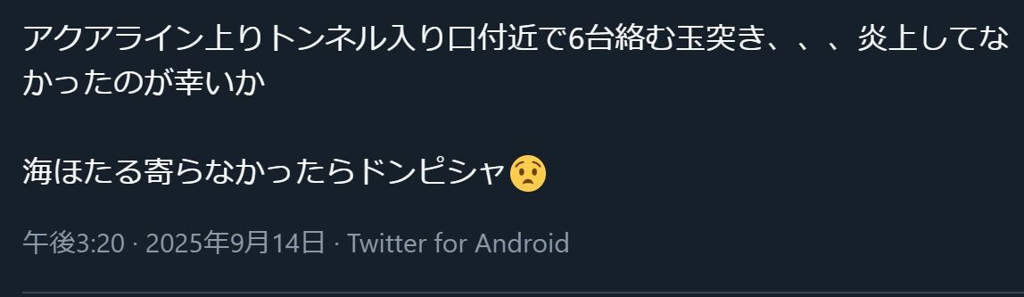 アクアライントンネル内で事故。渋滞。 pic.twitter.com/NAHYTbLA7J