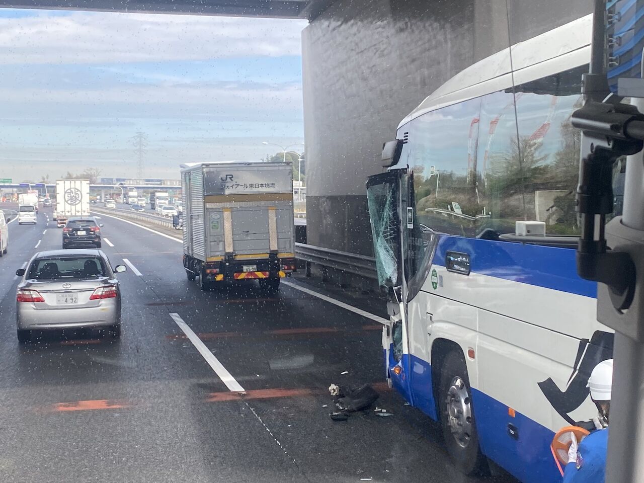 【現場の様子】#交通情報 #東北道 下り 浦和料金所付近 JR東日本物流トラックとJRバスの衝突事故で規制渋滞 バス車両フロント破損4月4日 #渋滞 #埼玉 #浦和 #JR東日本