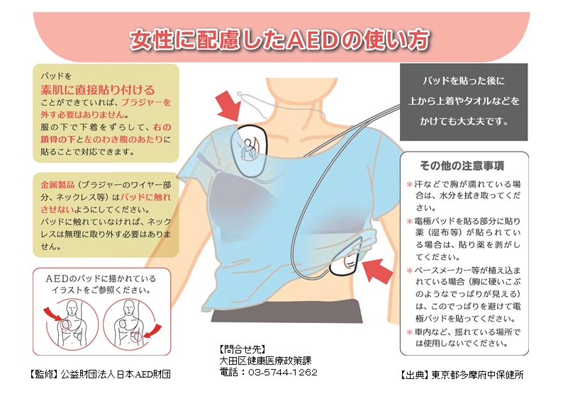AEDは電源を入れて2枚のパッドを素肌に貼りますが、服をすべて脱がせる必要はなく、下着をずらして貼ることで対応できます。また、パッドを貼ったあと、 その上から服などをかけて肌を隠すようにしても、AEDの機能に影響はありません。しかし、このような女性に配慮したAEDの使用方法が、一般の人に十分に浸透していないと思われます。