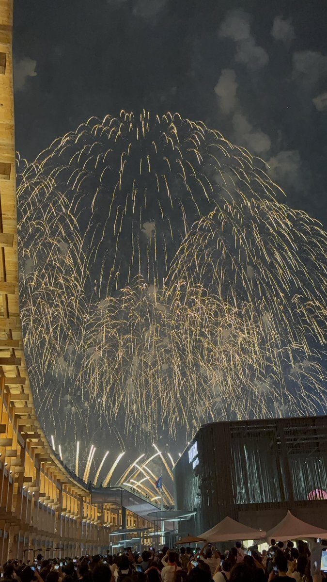 アオの観覧席から花火。上から降ってくる様だと思ったら本当に降ってきた。何かが頭に当たりました。怪我しなくてよかった。 #万博 pic.twitter.com/b5mMYyuAdv