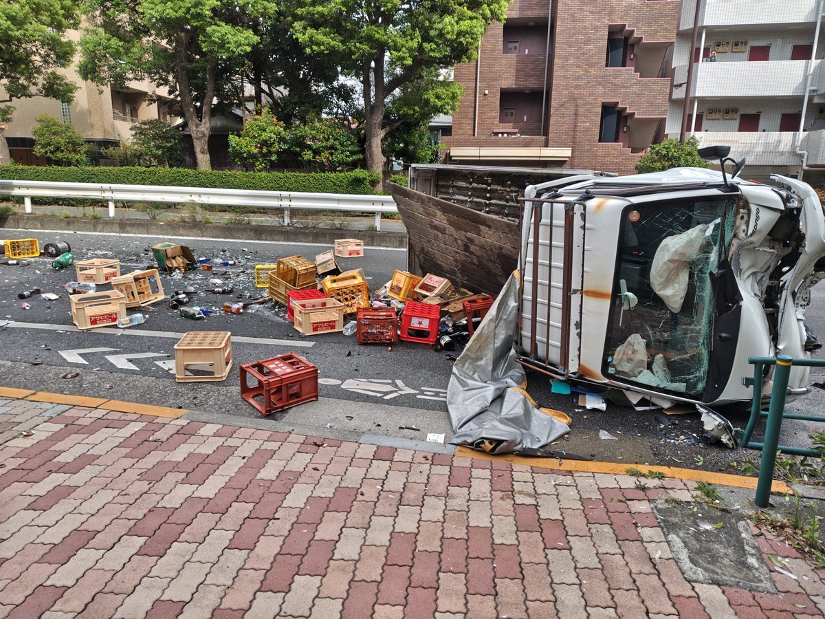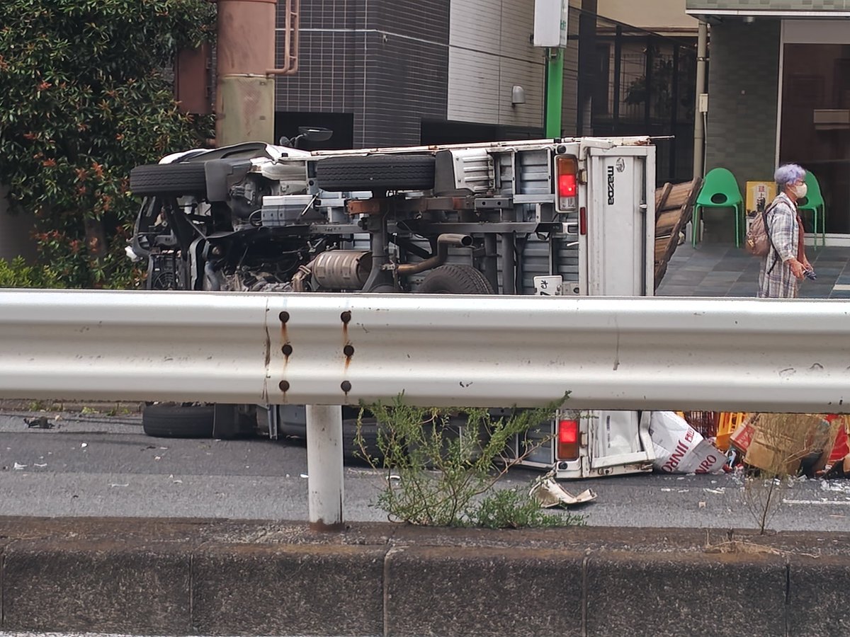 【現場の様子】#交通情報 環七通り 外回り 東京都中野区大和町2丁目付近 積荷散乱するトラック横転事故で一時通行止め9月22日 #環七 #中野 #高円寺 #野方