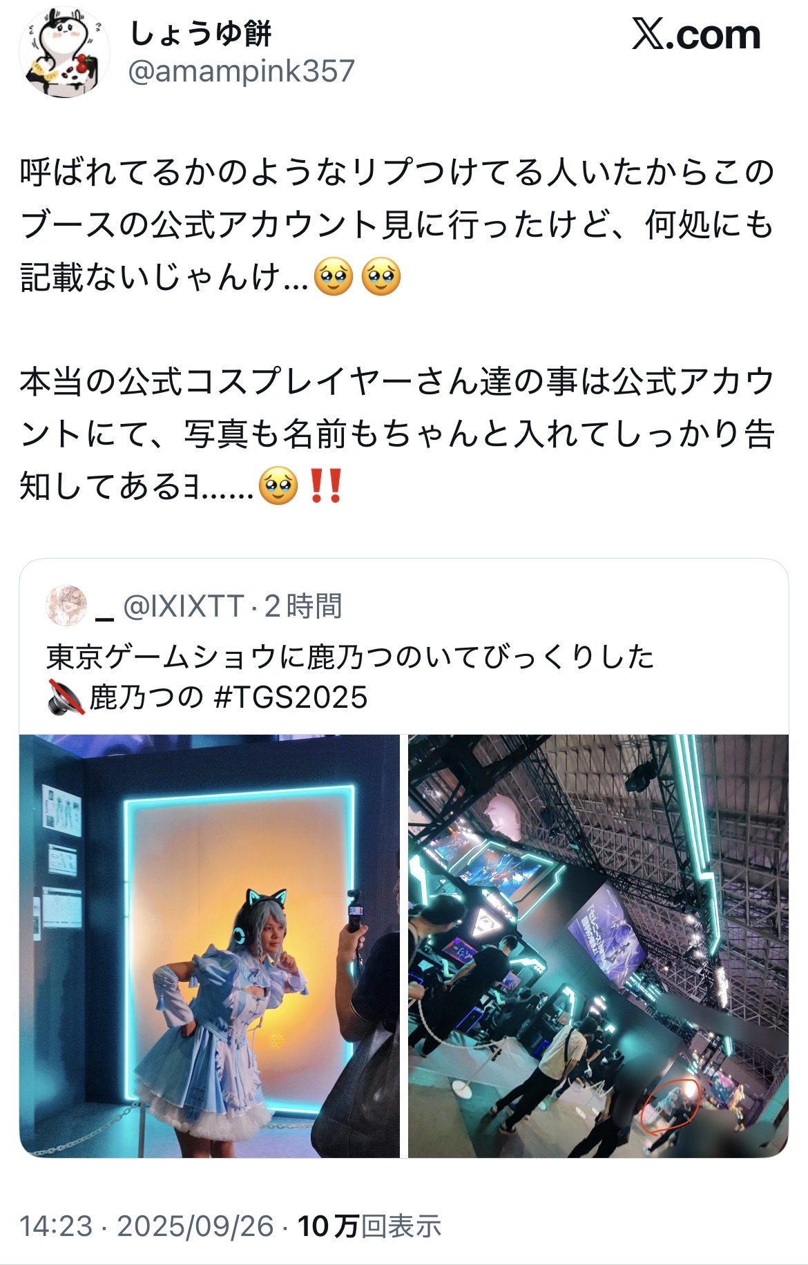 【最強】鹿乃つのさん、東京ゲームショウで公認レイヤーのふりをするwwwwwwwwwwwwwwwwwww 2025/9/26 速報 1: 公式サイトで一切紹介されてないのにコスプレブースにいるの普通に怖すぎ document.write(” + ”); 関連記事 【画像】女性外国人コスプレイヤー、ガチで可愛すぎるwww 【画像】完璧すぎる綾波レイのコスプレイヤー、発見されるwww 【画像】コスプレイヤーさん「プリクラに行ってきました。」パシャ →すごい透明感wwwwwwww 【画像】台湾の人気コスプレイヤーさん、パンはパンでも「とんでもないパン」を販売して物議にwwwwww 【悲報】話題のコスプレイヤー女さん、ライン超えの発言をして大炎上 document.write(” + ”); 続きを読む ——— Source: アルファルファモザイク 【最強】鹿乃つのさん、東京ゲームショウで公認レイヤーのふりをするwwwwwwwwwwwwwwwwwww