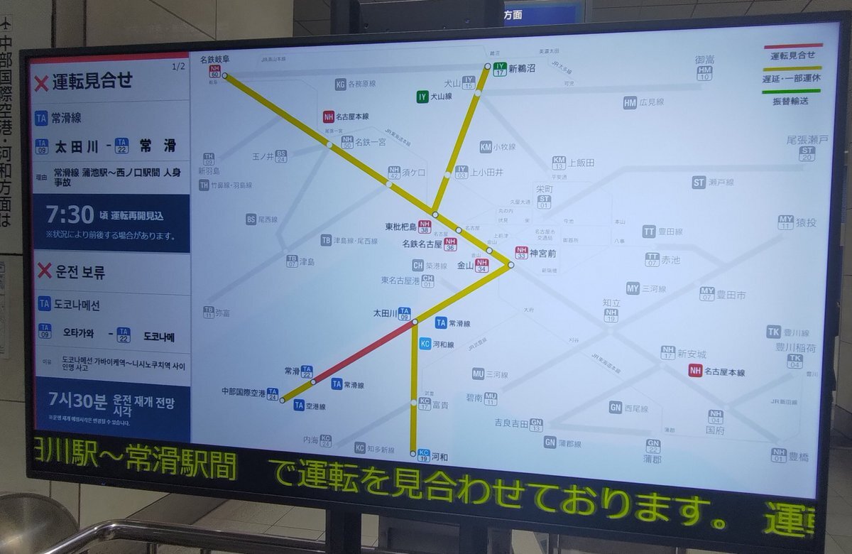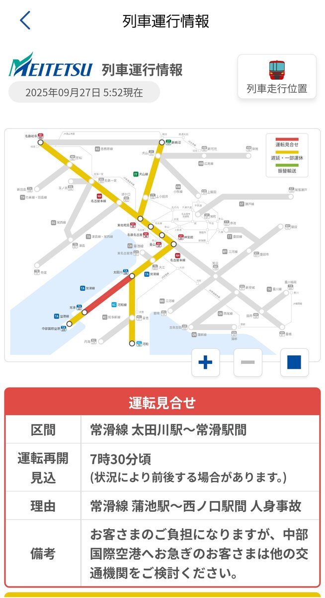 2025.9.27 6:00 セントレアへの名鉄常滑線は運転見合わせとなっています。運転再開は7:30頃とのことです。ご利用の方はご注意下さい。 https://t.co/ZutKdTaxmV