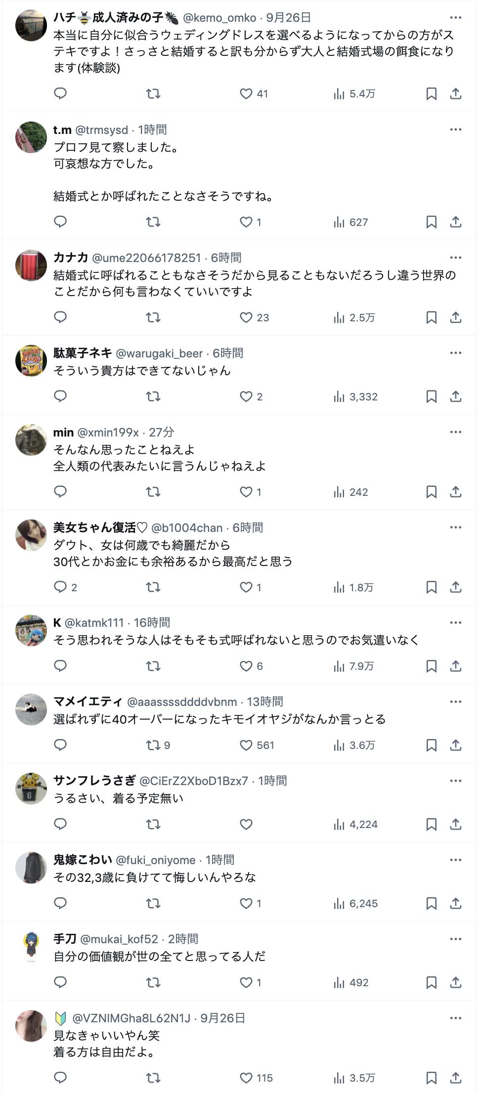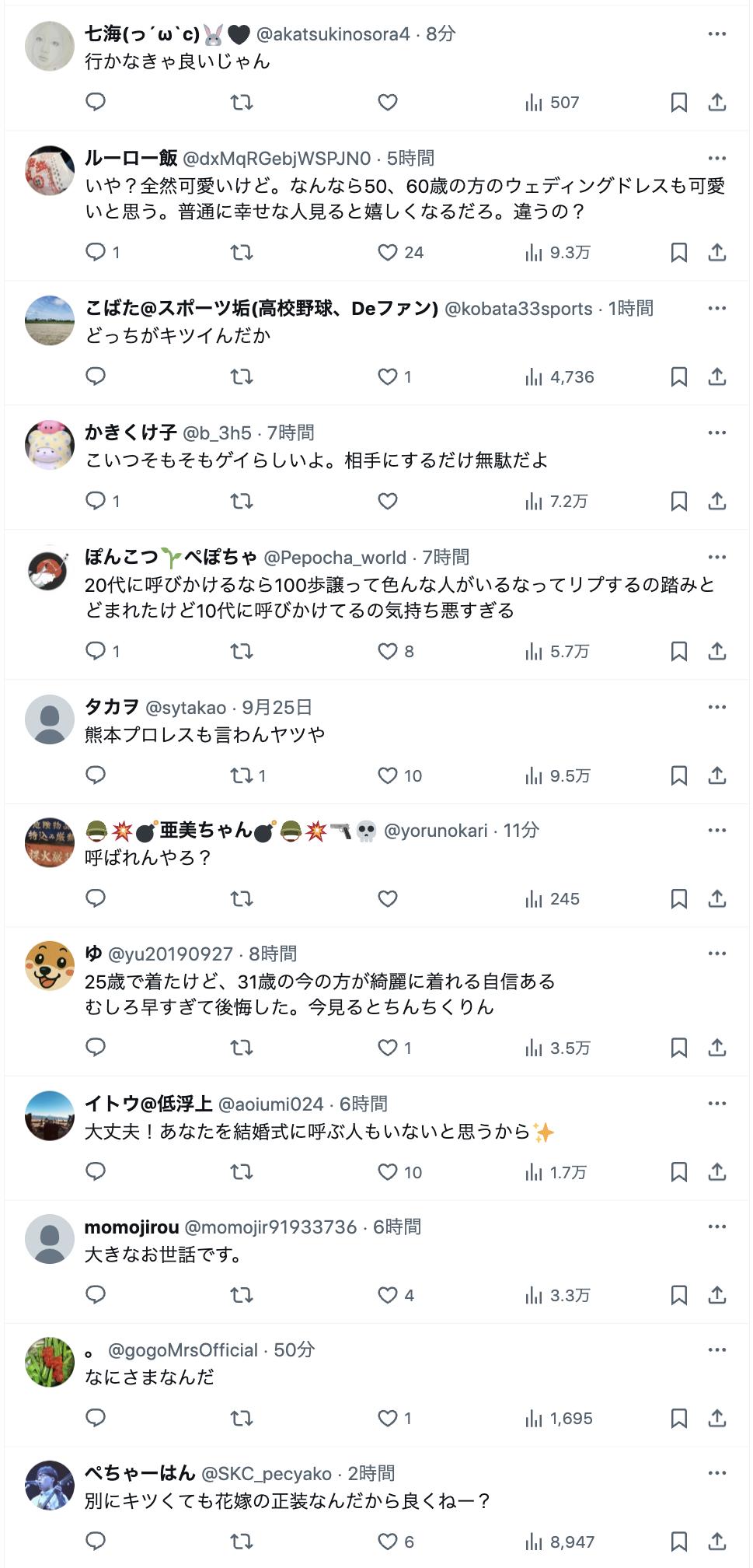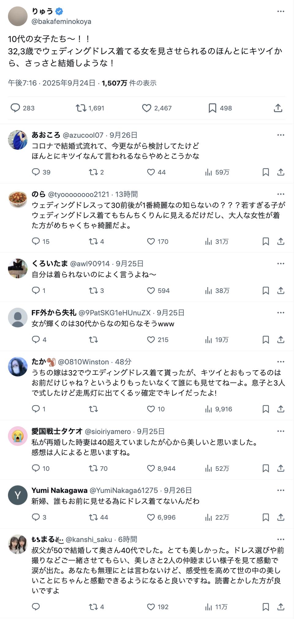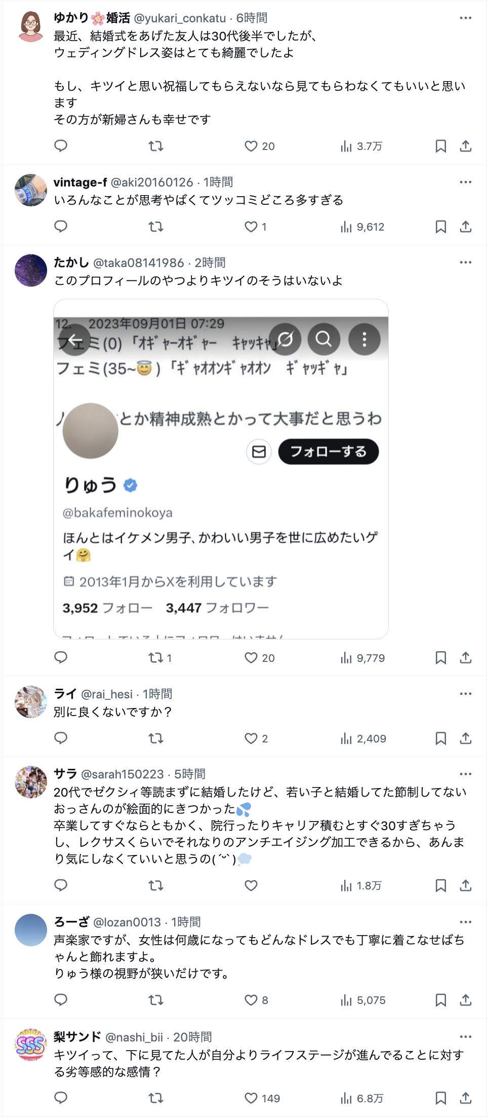 【炎上】ゲイさん「32,3歳でウェディングドレス着てる女を見させられるのほんとにキツイ」→大炎上へ 2025/9/28 速報 1: — (@bakafeminokoya) document.write(” + ”); 関連記事 【悲報】ハイスペ婚活ちゃん、ウェディングドレスで撮影会 → 3週間後に地獄の展開に 【悲報】セクシー女優「え待って、一般人って純白のウェディングドレス着れば純潔に戻れるって思ってんの?」 【悲報】三上悠亜ウェディングドレス騒動、遂に未婚男性まで叩かれ始めるwwwwwwwwwwwwwwwwww 【悲報】セクシー女優さん、ウェディングドレスのモデルをして叩かれまくってしまう 【可哀想】櫻井孝宏と10年付き合ってた女ラジオ作家「ウェディングドレス来年作りに行くんだー」 document.write(” + ”); 続きを読む ——— Source: アルファルファモザイク 【炎上】ゲイさん「32,3歳でウェディングドレス着てる女を見させられるのほんとにキツイ」→大炎上へ