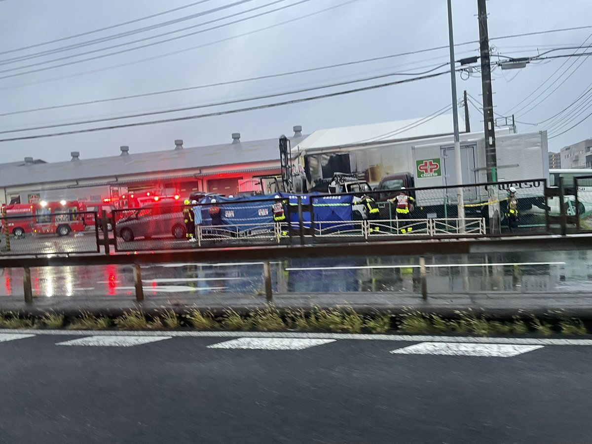 『座間の246下り沿いの中越運送大火災やないかい。トラック燃えてるわフォークリフト燃えてるわで消防車消火活動しとったわなぜ敷地内で火災なんだ』