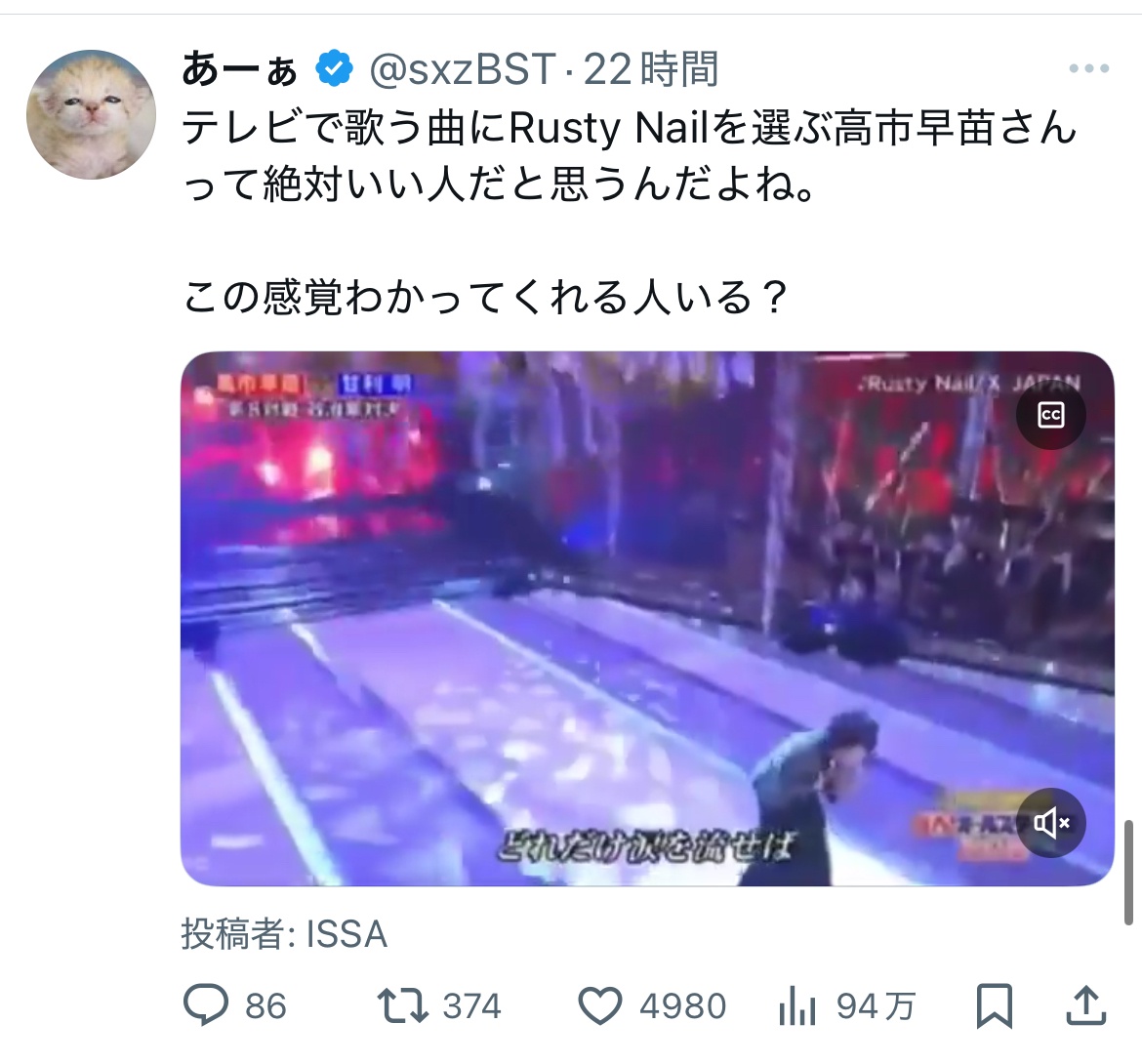 【速報】高市早苗「それでは聞いてください!X-JAPANからRustyNail!」 2025/10/1 速報 1: — (@sxzbst) document.write(” + ”); 関連記事 【悲報】テレビ朝日さん、うっかり候補者討論会で高市早苗を冷遇してしまい炎上wwwwwwwwwwwwwwwwwwwwww 【悲報】高市早苗さん、痛恨のミスでデマを拡散してしまう… 【悲報】高市早苗さん、敗北がほぼほぼ確定。 【サンモニ】安田菜津紀さん「高市早苗さんのような態度の為政者ばかりになったら社会は滅びる!」 【悲報】高市早苗「やっぱ消費税減税は無理。レジのシステム改修が1年かかる。」 document.write(” + ”); 続きを読む ——— Source: アルファルファモザイク 【速報】高市早苗「それでは聞いてください!X-JAPANからRustyNail!」