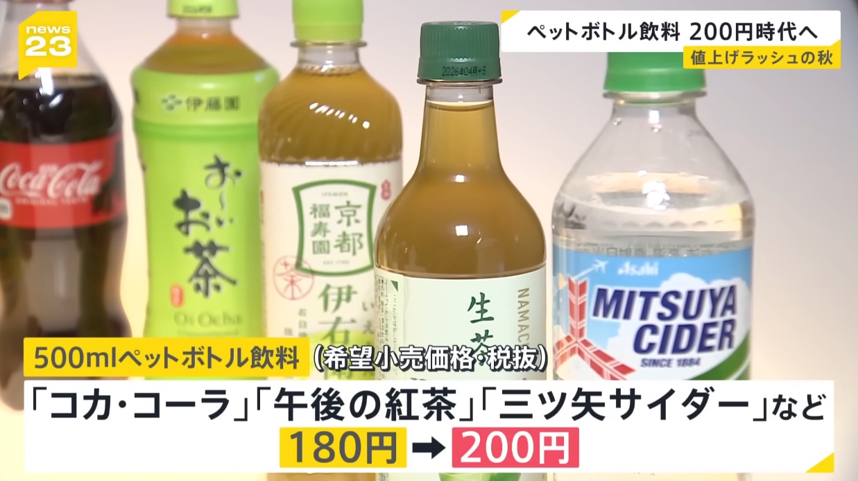 ペットボトル飲料では、200円台に達する商品も相次ぎ、一部商品の税抜きの希望小売価格が180円から200円に引き上げられる。