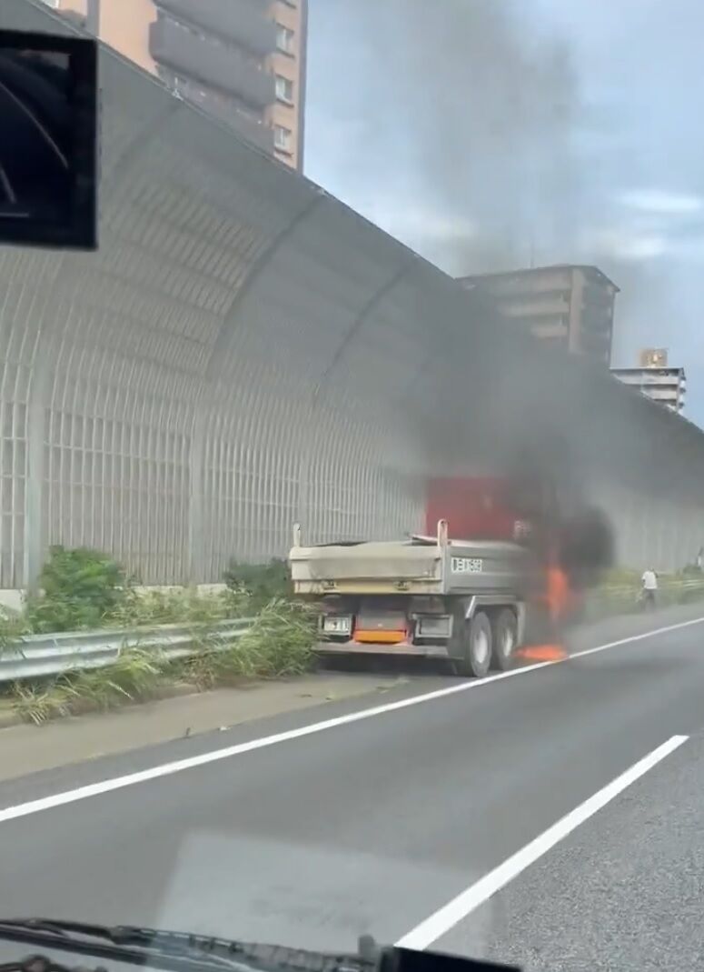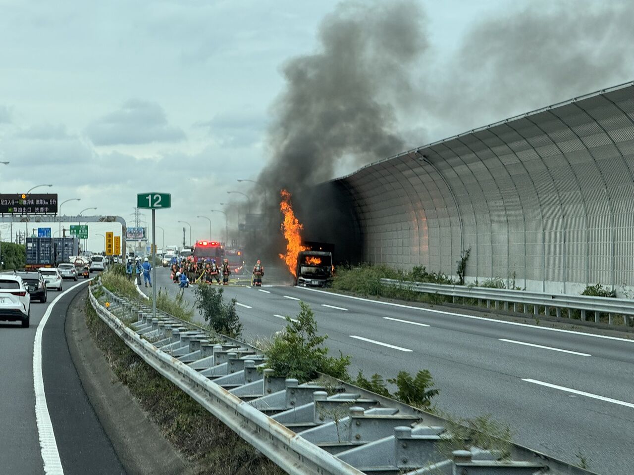 『東北道下り岩槻先ダンプ火災中〜これから渋滞するじゃろな』