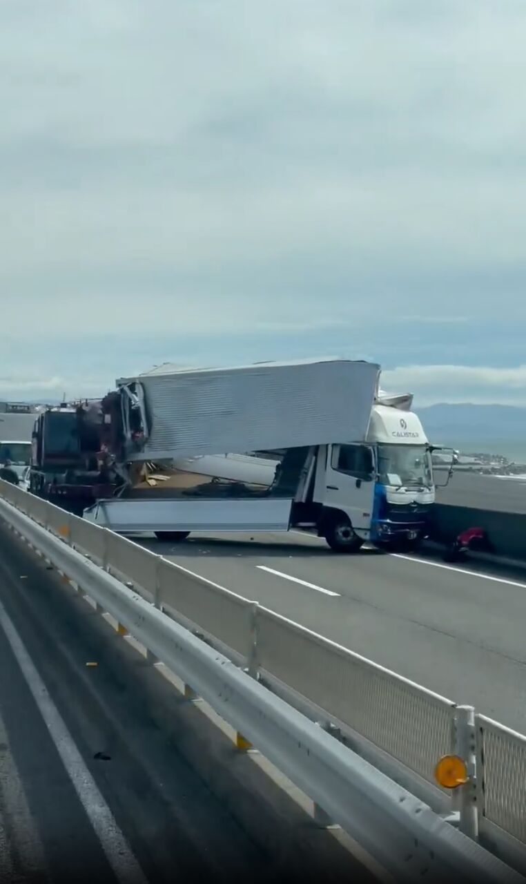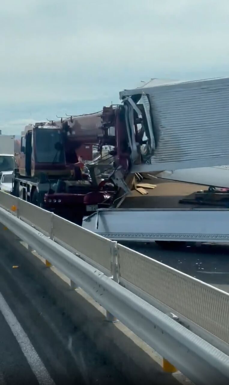 『国道1号 静岡県 由比付近でラフタークレーンがアルミウイング車ド突いてた