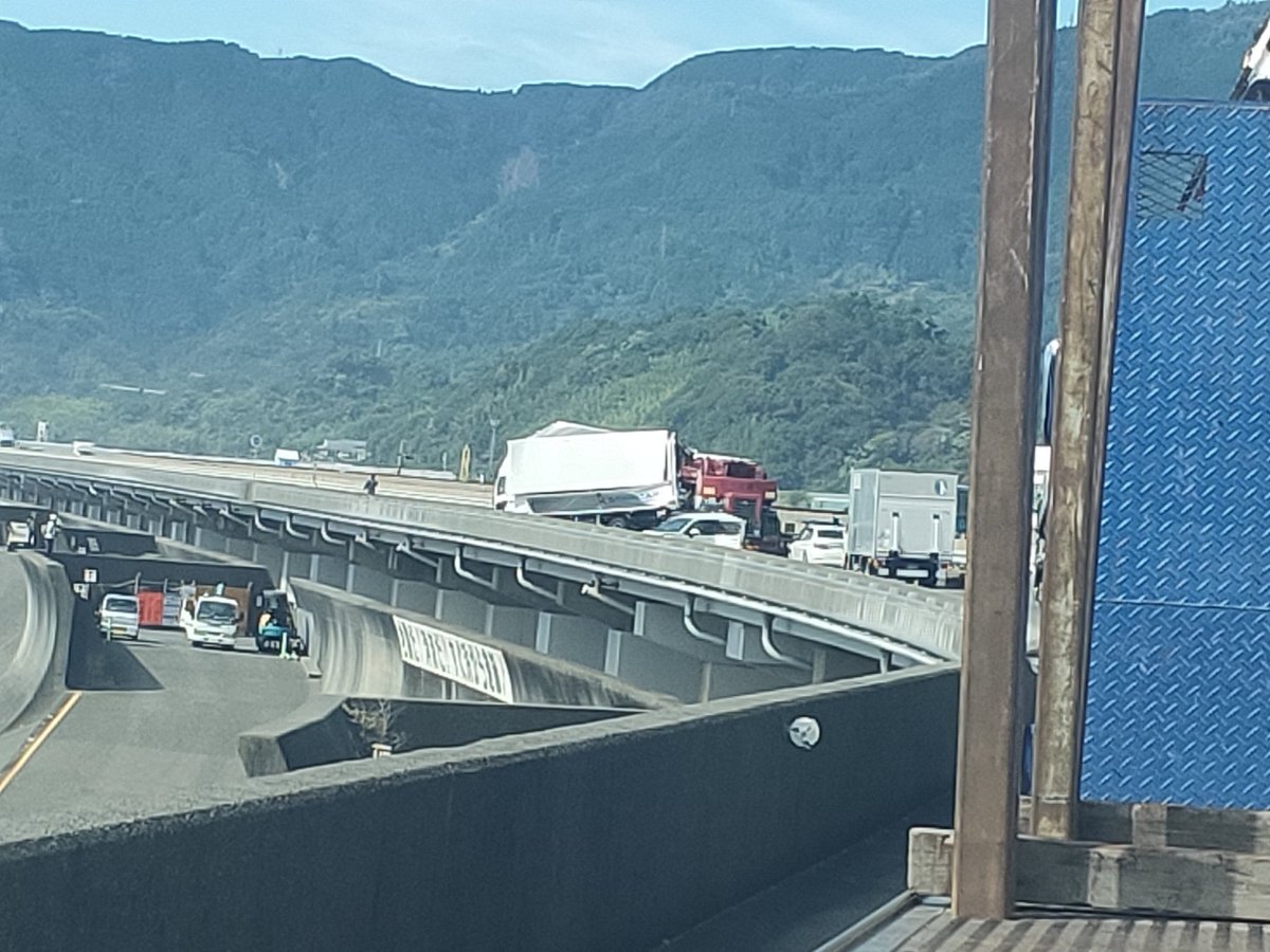 【現地の状況】#交通情報 国道1号線 富士由比バイパス 下り 高浜IC→蒲原西IC付近 ラフタークレーンと大型トラック衝突事故で通行止め渋滞10月9日 #静岡 #清水区