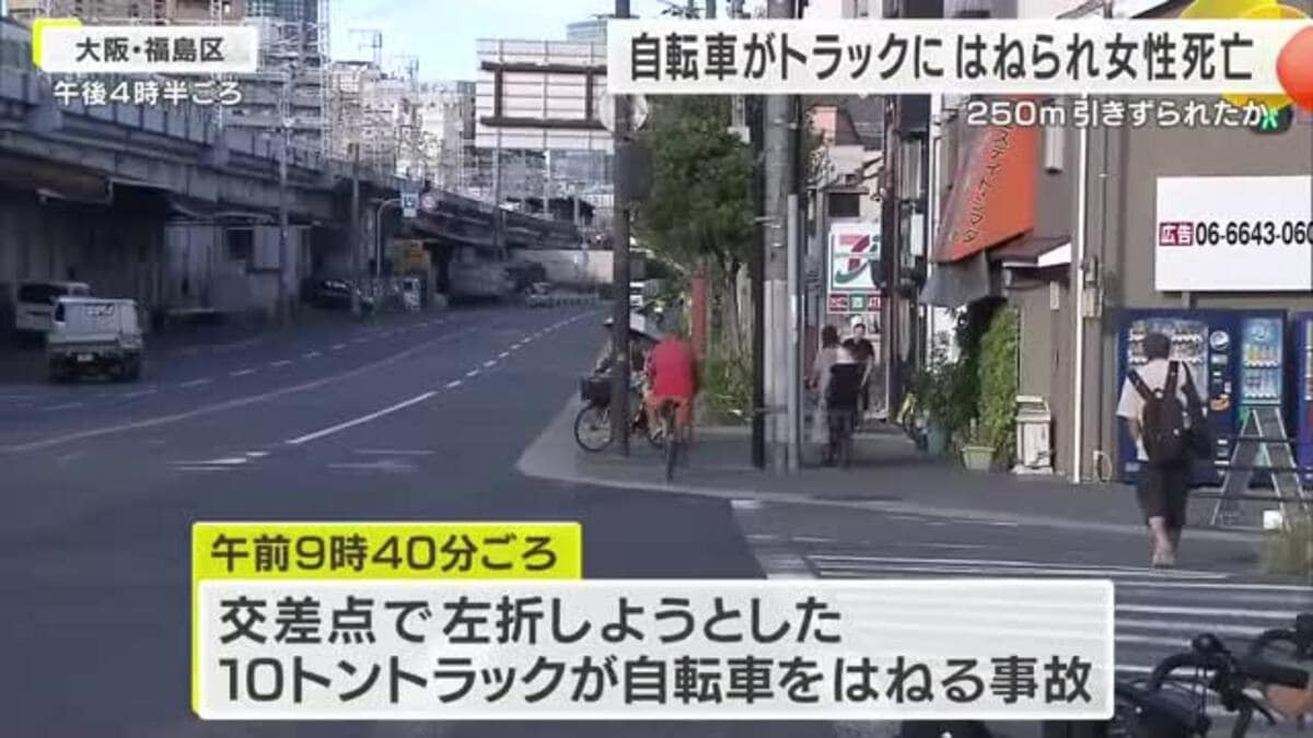 大阪・福島区の交差点で、自転車の女性がトラックと接触し、約250メートル引きずられました。女性は死亡し、警察はトラック運転手の男を逮捕しました。
