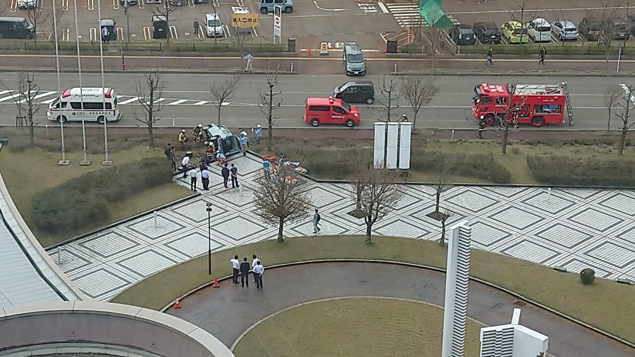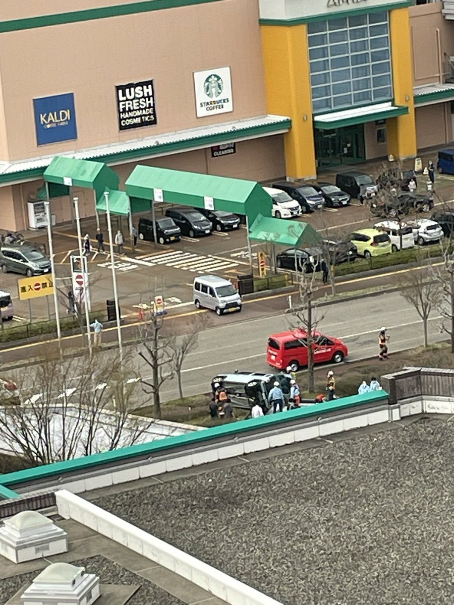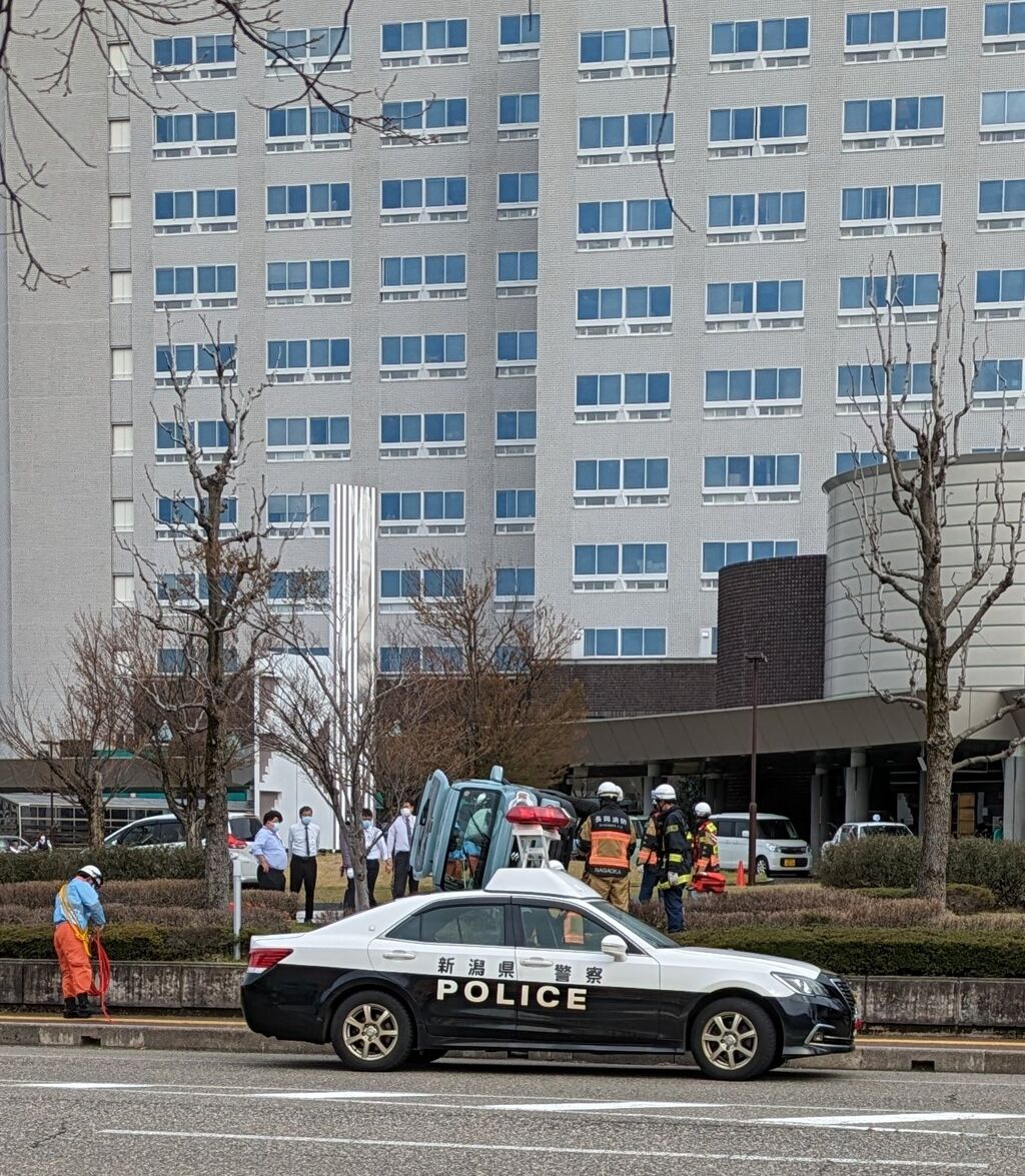 【現場の様子】#交通情報 新潟県長岡市千秋2丁目 長岡赤十字病院敷地内で横転事故4月8日 #新潟 #長岡 #病院 #リバーサイド千秋