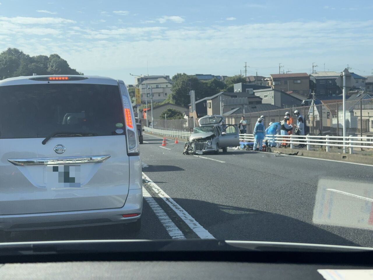 『松戸と流山の境で車両事故発生。上下線とも1車線ずつ塞がってます。』