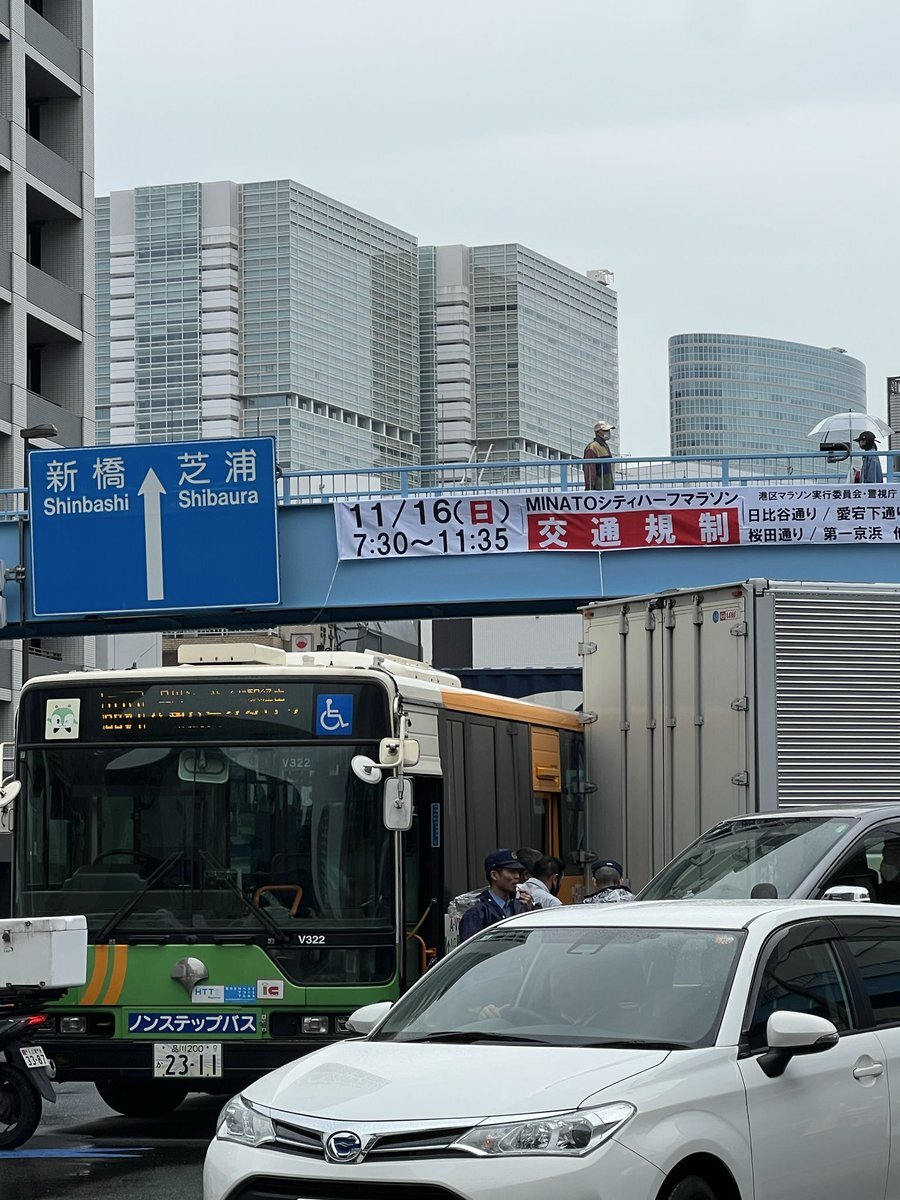 【現場の状況】#交通情報 海岸通り 東京都品川区東品川1丁目 新東海橋交差点付近 都営バスとトラック接触事故で規制渋滞10月24日 #品川 #天王洲アイル #新馬場 #バス