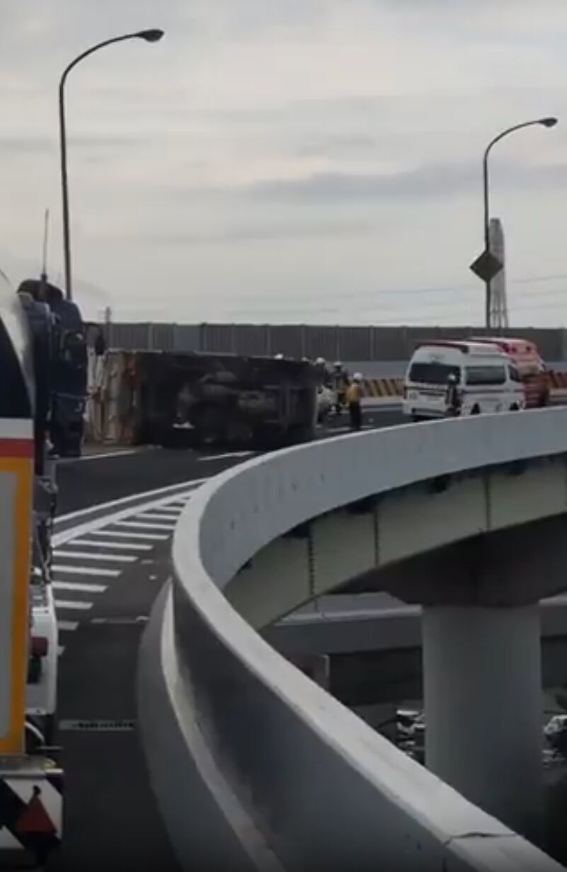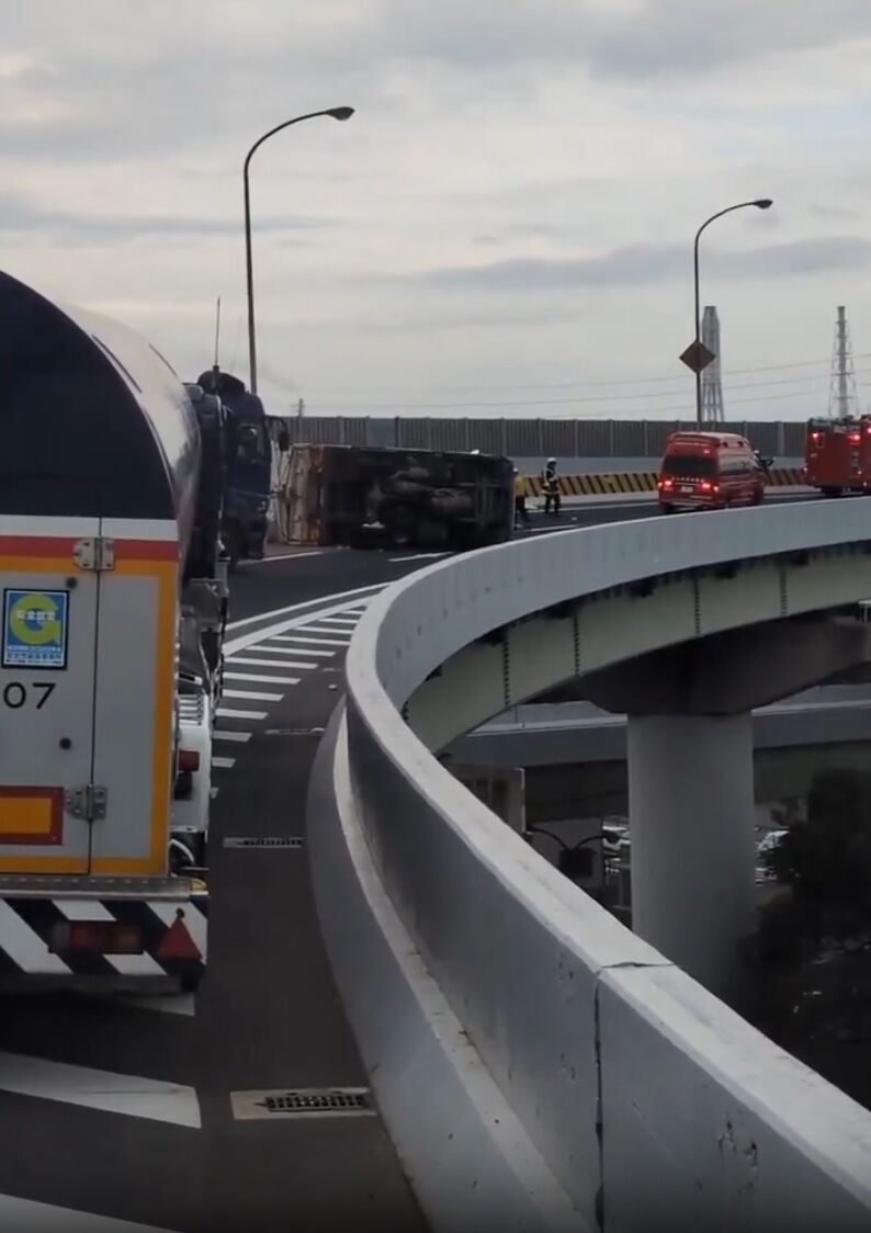 『都市高でトラック横転してて草』