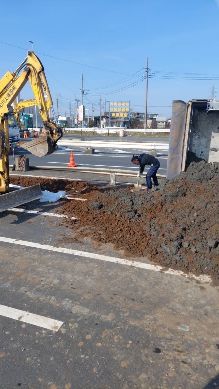 土ブチまけてるので反対側も車線規制。関○車両のOCが来てるけど、土掻き出さないと1台じゃ起きないでしょw pic.twitter.com/4cLBYvPZX2