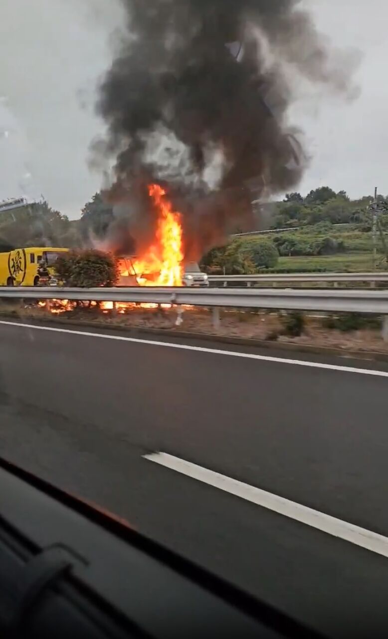 上信越道、吉井ICを長野方面へ入ってすぐのとこで事故車が炎上中。