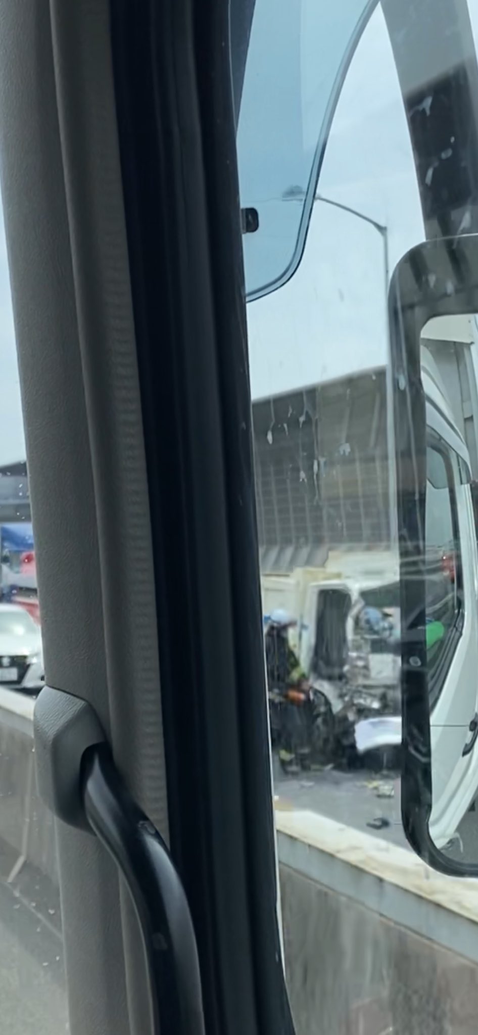 真ん中車線に、4トンダンプが、前がめちゃくちゃに潰れて停車』