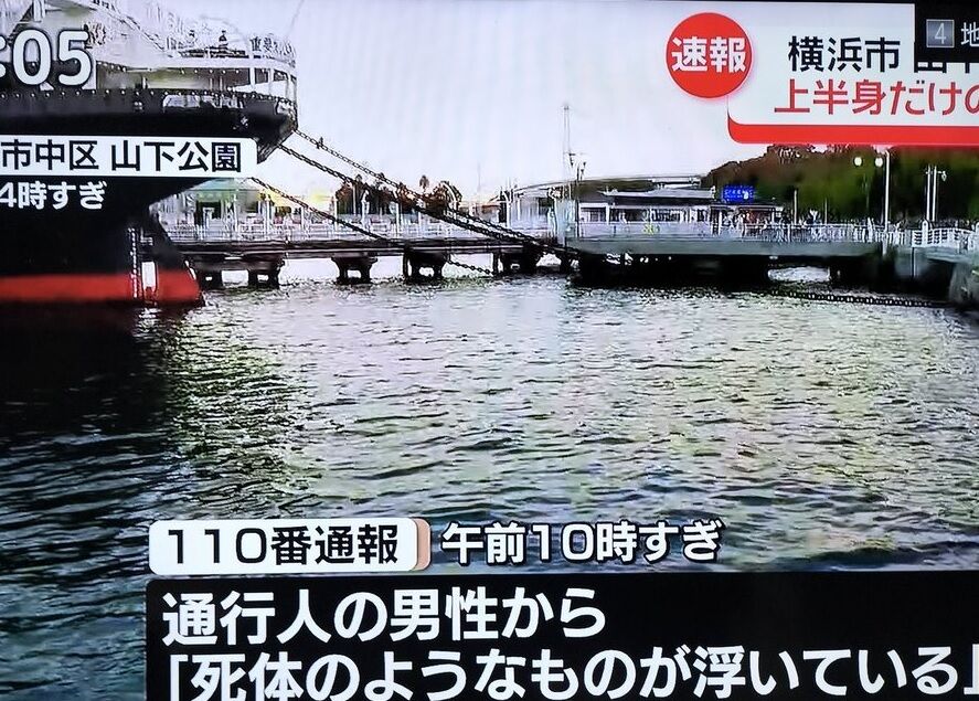 朝の10時頃に山下公園公園岸壁で上半身のみの遺体が浮いているのを発見したとかヤバいな。
