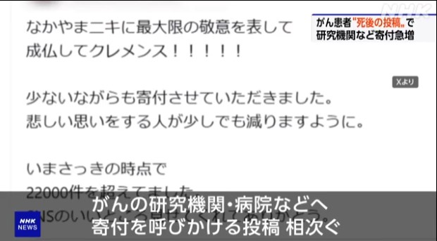 「グエー死んだンゴ」で最期を飾ったなかやまニキ、NHKでも特集 →寄付ムーブ3.3億imp超えで社会現象にwww 2025/11/3 速報 1: — (@yuruhuwa_kdenpa) ↓↓↓ — (@yuruhuwa_kdenpa) ↓↓↓ — (@yuruhuwa_kdenpa) ↓↓↓ — (@MK_ICHIKAWA) document.write(” + ”); 関連記事 【速報】「グエー死んだンゴ」 新聞記事になってしまうwwwwwwwwwwwwwwwww 【悲報】予約投稿で「グエー死んだンゴ」ネット民哀悼←わかる 医療機関に香典続々←わかる 香山リカ、参戦←??? がん闘病中だった22歳大学生「グエー死んだンゴ」とX(Twitter)に予約投稿してこの世を去る document.write(” + ”); 続きを読む ——— Source: アルファルファモザイク 「グエー死んだンゴ」で最期を飾ったなかやまニキ、NHKでも特集 →寄付ムーブ3.3億imp超えで社会現象にwww