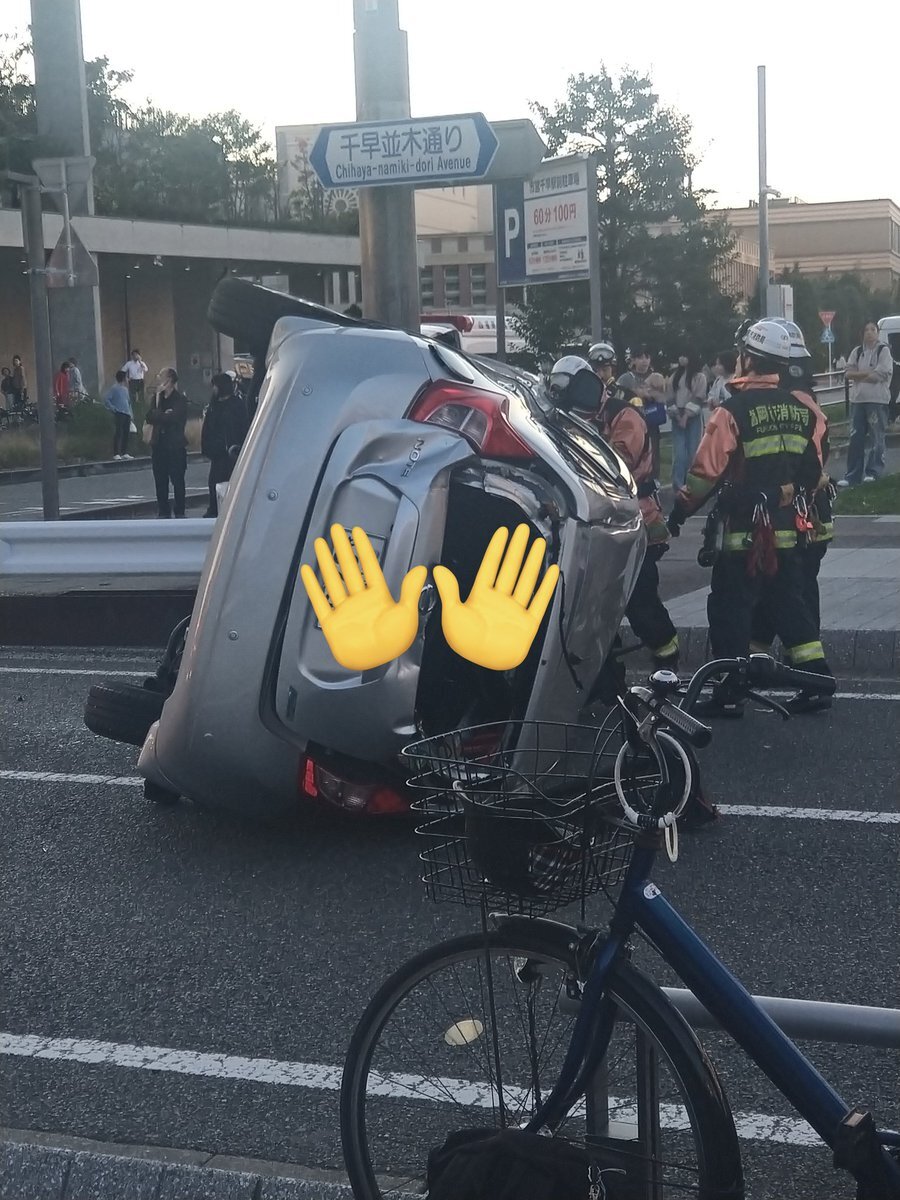 『千早駅前で車がひっくり返ってる』