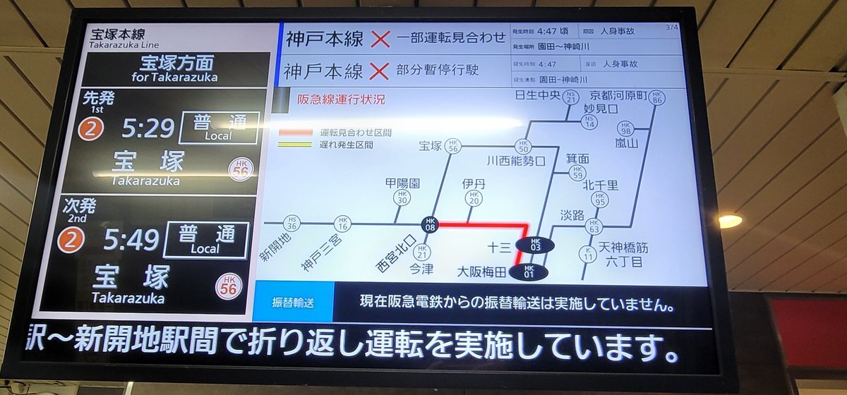 人身事故で運転見合わせしている阪急神戸線🚃は5:45の時点で大阪梅田~新開地間の全線で運転見合わせやで。#阪急電鉄 pic.twitter.com/Hg7T0qMpmE