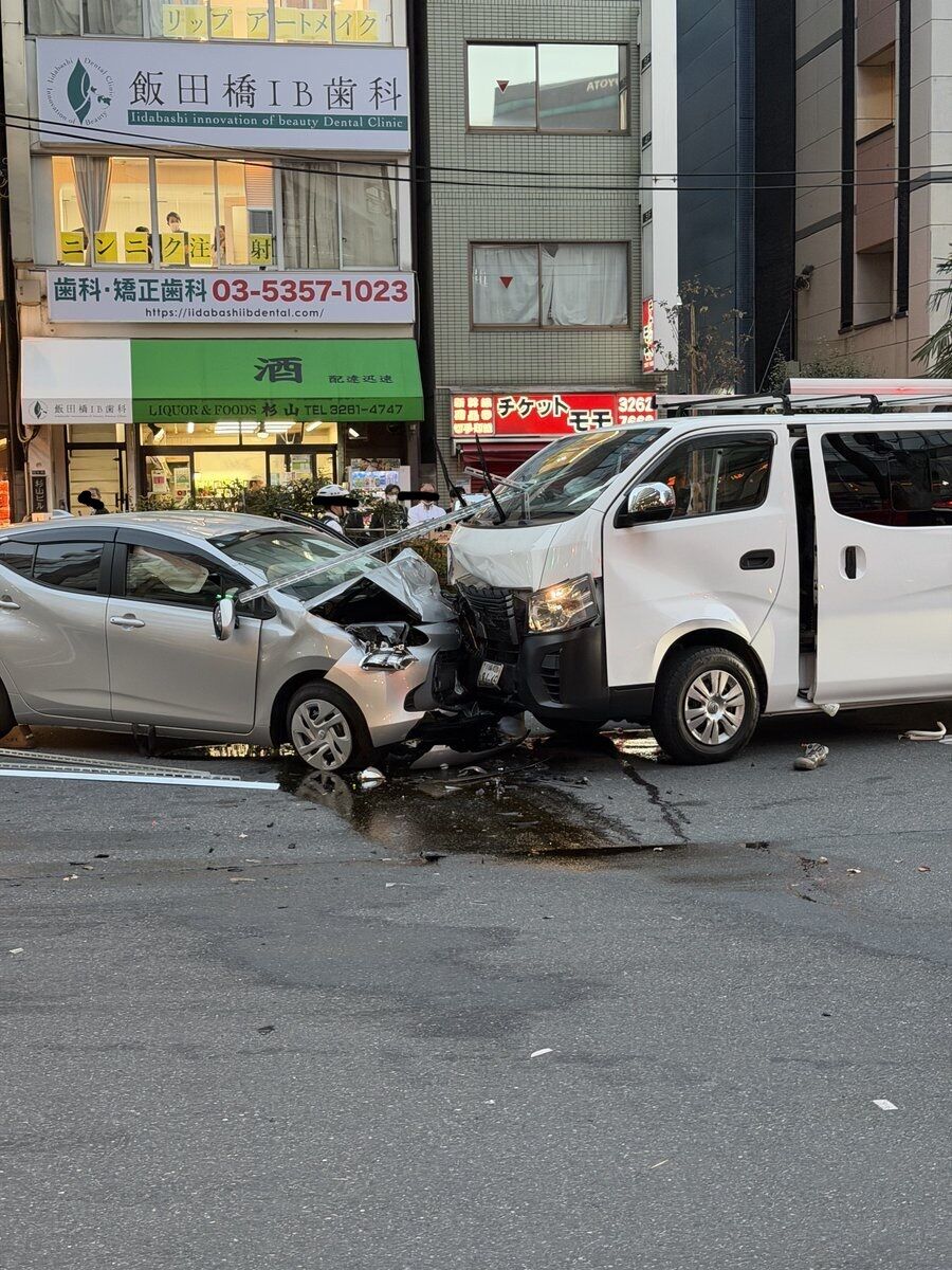 【現場の状況】#交通情報 目白通り 東京都千代田区飯田橋3丁目交差点付近 車両大破するワゴン車と乗用車の正面衝突事故で規制渋滞11月7日 #千代田区 #飯田橋