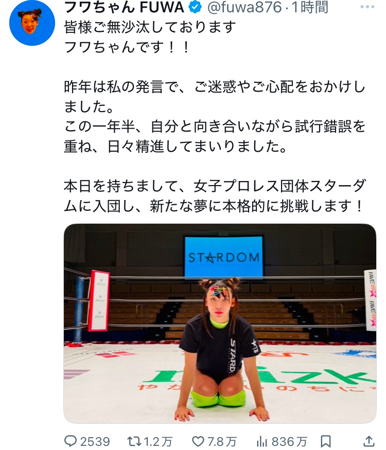 【動画】フワちゃん、ガチでプロレスラーとして活動再開へwwwwwwwwwwwwwwwwwwwwwwwww 2025/11/8 速報 1: https://www.youtube.com/watch?v=guTo6LYLoAs&t=3120 document.write(” + ”); 関連記事 【速報】フワちゃん、プロレスで活動復帰! 休止から1年wwwwwwwwwww 【悲報】フワちゃん、予告映像に名前が出ただけでネット大荒れwwwww フワちゃん「お前は偉くないので、死んでくださーい」→番組降板実質芸能界引退 田原総一朗「あんな奴は死んでしまえと言えばいい」→厳重注意 どうしてなのか 昔の篠原ともえってフワちゃんみたいなキャラだったのになんで叩かれなかったの? 【悲報】フワちゃん、地上波復活で大炎上 【画像】女さん「あれ?ユニフォームの下にスク水着て野球すればいいんじゃねーの?w」パシャッ document.write(” + ”); 続きを読む ——— Source: アルファルファモザイク 【動画】フワちゃん、ガチでプロレスラーとして活動再開へwwwwwwwwwwwwwwwwwwwwwwwww