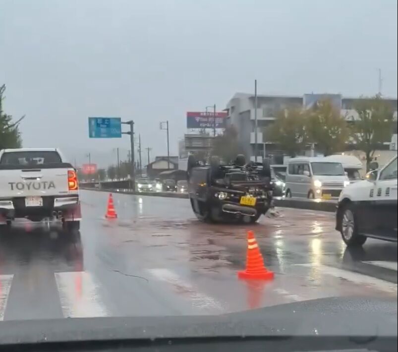 今国道156号上印食付近で車がひっくり返った事故発生。