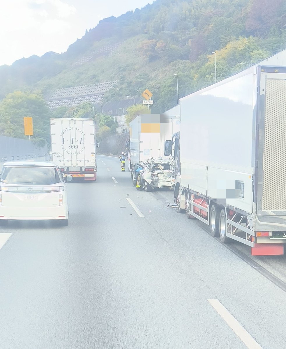 『東名下り、大井松田〜鮎沢PAの間で事故。車がサンドイッチされてた😵💫』