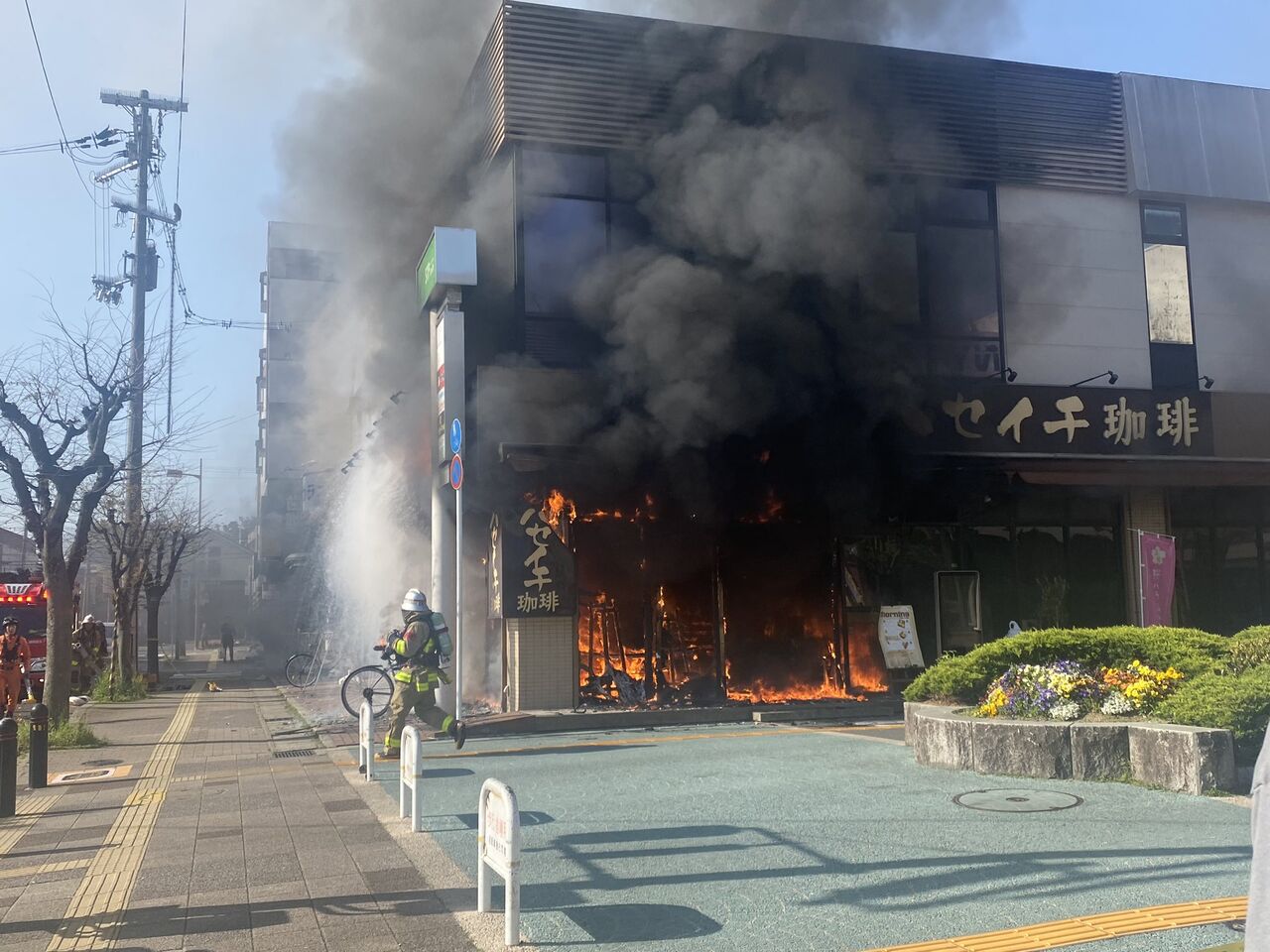 【火事情報】京都府京田辺市田辺中央1丁目 #近鉄京都線 新田辺駅西口 ハセイチ珈琲店付近 建物から火の手あがる火災4月14日 #京都 #京田辺 #新田辺 #火災