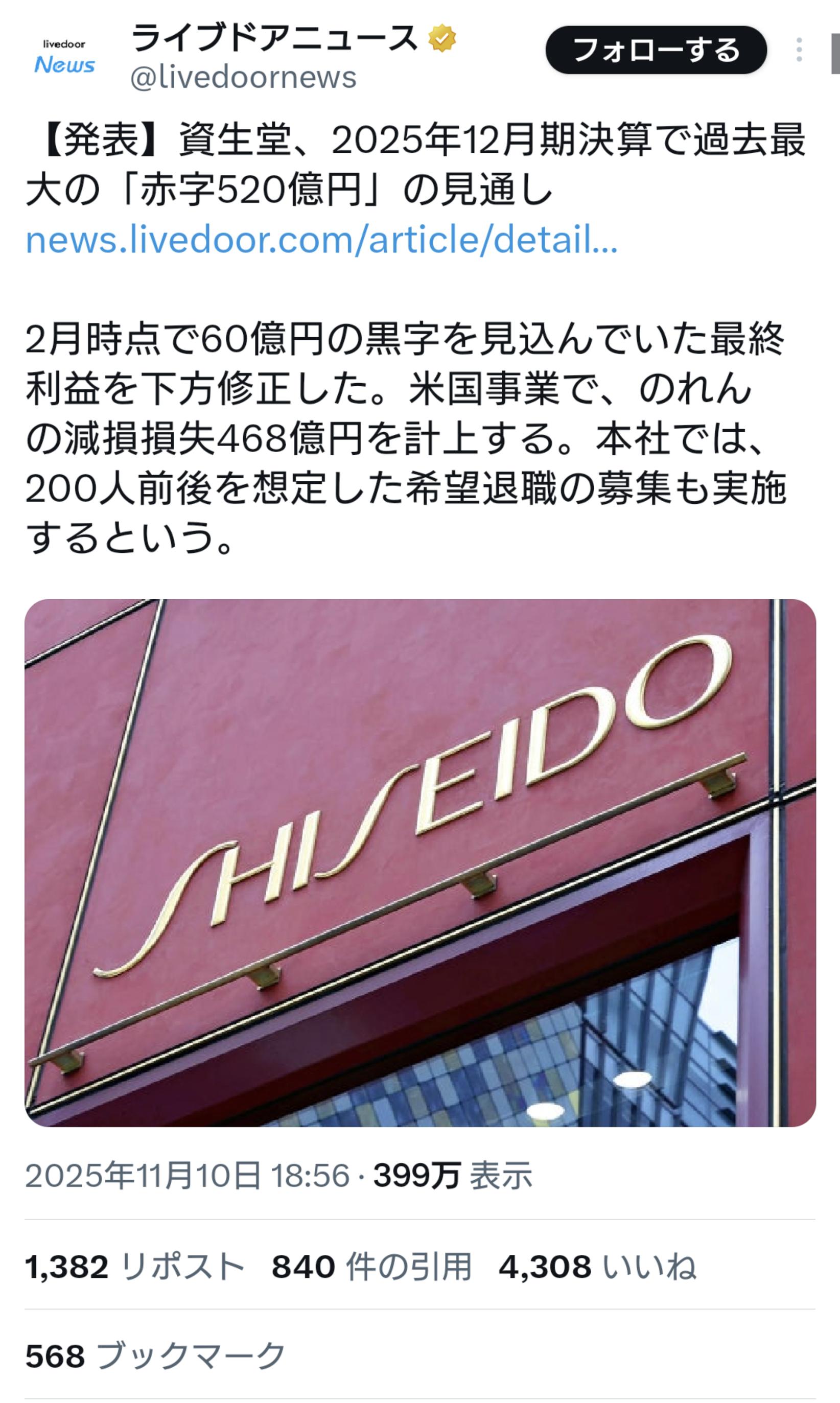 【悲報】資生堂さん、女性を優遇しまくった結果wwwwwwwwwwwwwwwwwwwwwwwww 2025/11/12 速報 https://alfalfalfa.com/articles/10968391.html 1: 性別じゃなくて能力で管理職選べや… document.write(” + ”); 関連記事 【終了】資生堂、60億円の黒字としていた従来予想を下方修正し過去最大赤字520億円に ←どうしてこうなったと話題に 【悲報】江口寿史さん、超大手の資生堂でも堂々とヤッていたと判明wwwwwwwwwwwwwwwwwwwwww 【悲報】資生堂、ガチで壊滅的。。。 【悲報】資生堂の広告「マスクを外すとみんないい顔してる」→マスク民ブチギレ 【画像】女さん「あれ?ユニフォームの下にスク水着て野球すればいいんじゃねーの?w」パシャッ document.write(” + ”); 続きを読む ——— Source: アルファルファモザイク 【悲報】資生堂さん、女性を優遇しまくった結果wwwwwwwwwwwwwwwwwwwwwwwww