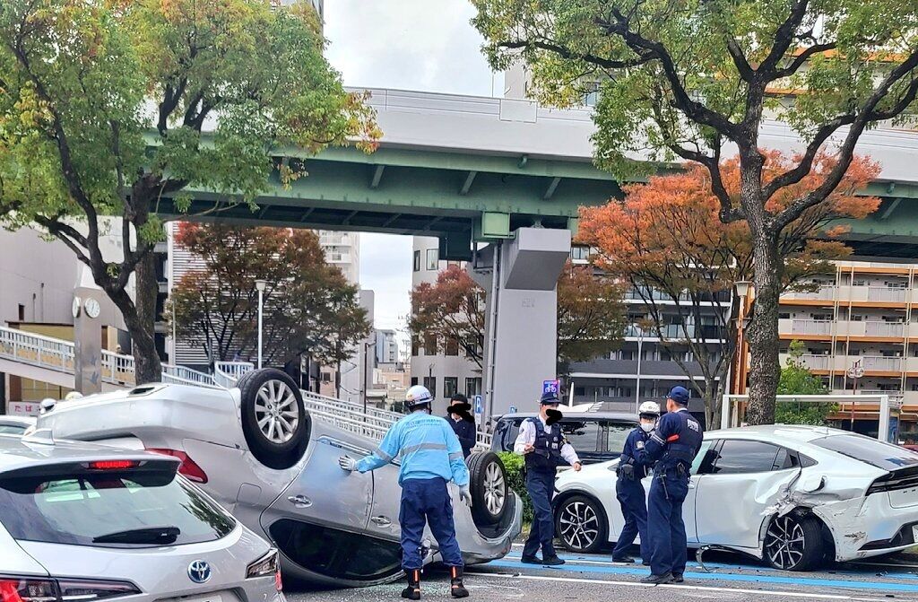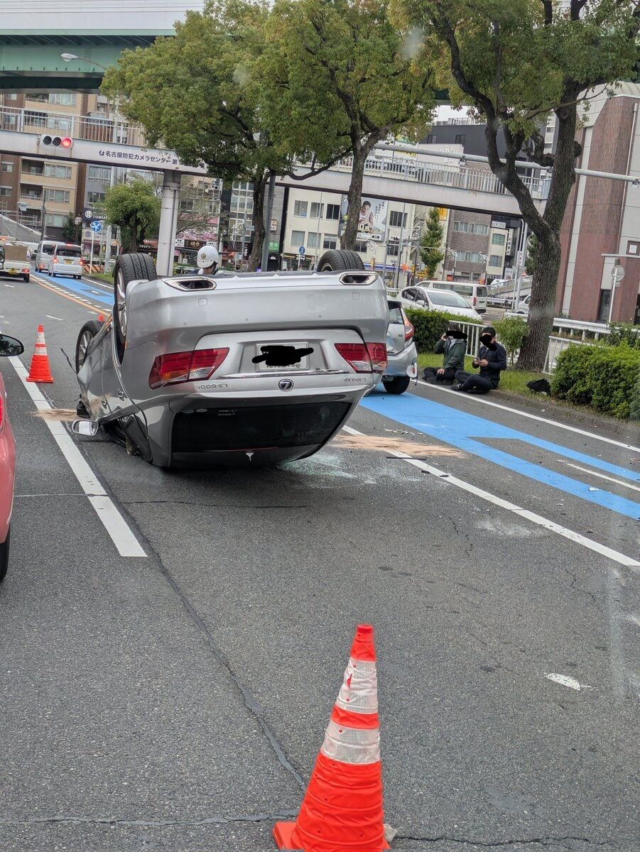 『鶴舞交差点付近右折レーン車2台の横転事故。首を抑えて外で会話してたから、事故直後かと。