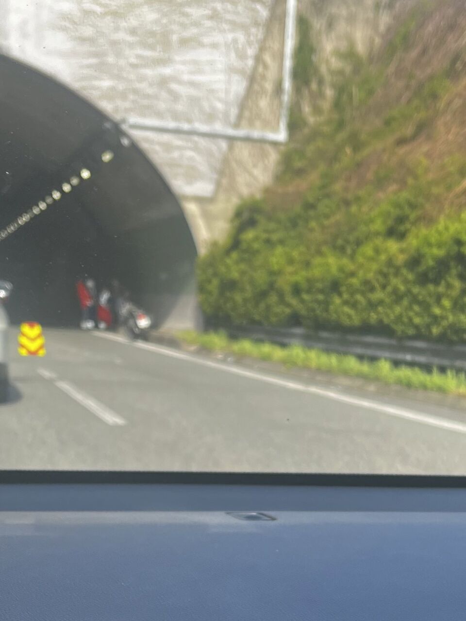 『中央自動車道の上り東京方面の談合坂SA手前約2km(山梨県)の中野トンネルの入り口で、中型バイクとプリウスの接触事故で3車線のうち左右が規制(真ん中一車線のみ通行)で渋滞発生中』