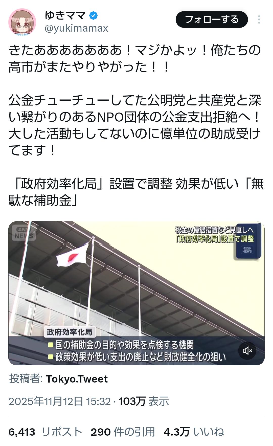 【速報】俺達の早苗、公金チューチュー系法人を潰しにかかるwwwwwwwwwwww 2025/11/14 速報 https://alfalfalfa.com/articles/10968914.html 1: https://video.twimg.com/amplify_video/1988475402923503620/vid/avc1/1920×1080/wInl25UwGkCWSPbV.mp4 document.write(” + ”); 関連記事 【速報】中国、台湾巡る高市首相の発言「直ちに撤回しなければならない。さもなければ日本は全ての責任を負うことになる」 【速報】高市首相、買春を法規制へ 【自民党】高市早苗さんの経済政策第2弾、プレミアム商品券・マイナポイントと判明WWWWWWWW 高市首相「中国が台湾を攻撃したら日本の存立危機になる」 ←これ 【悲報】NHK、またやらかす!高市内閣 支持しない15%を42%にしてしまうwwwww 【画像】女さん「あれ?ユニフォームの下にスク水着て野球すればいいんじゃねーの?w」パシャッ document.write(” + ”); 続きを読む ——— Source: アルファルファモザイク 【速報】俺達の早苗、公金チューチュー系法人を潰しにかかるwwwwwwwwwwww