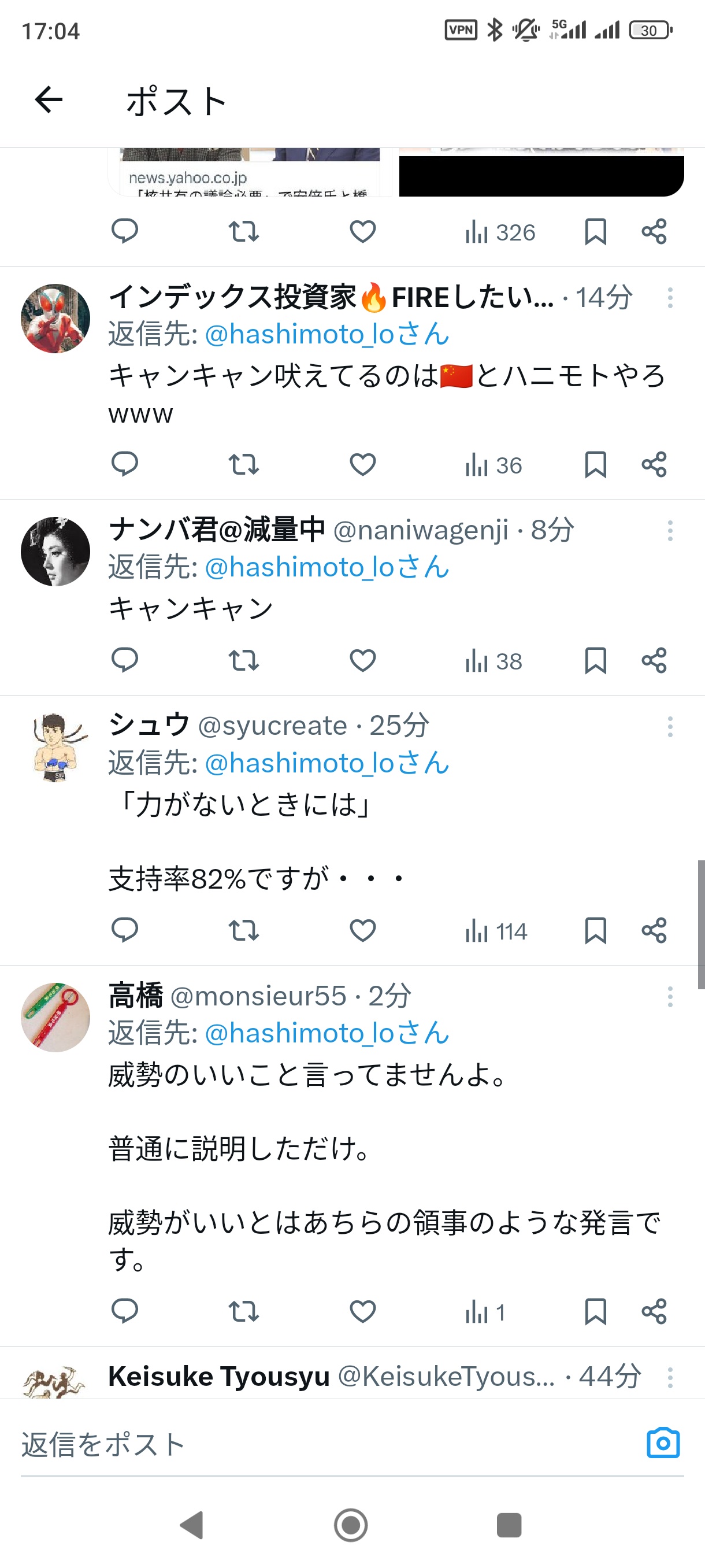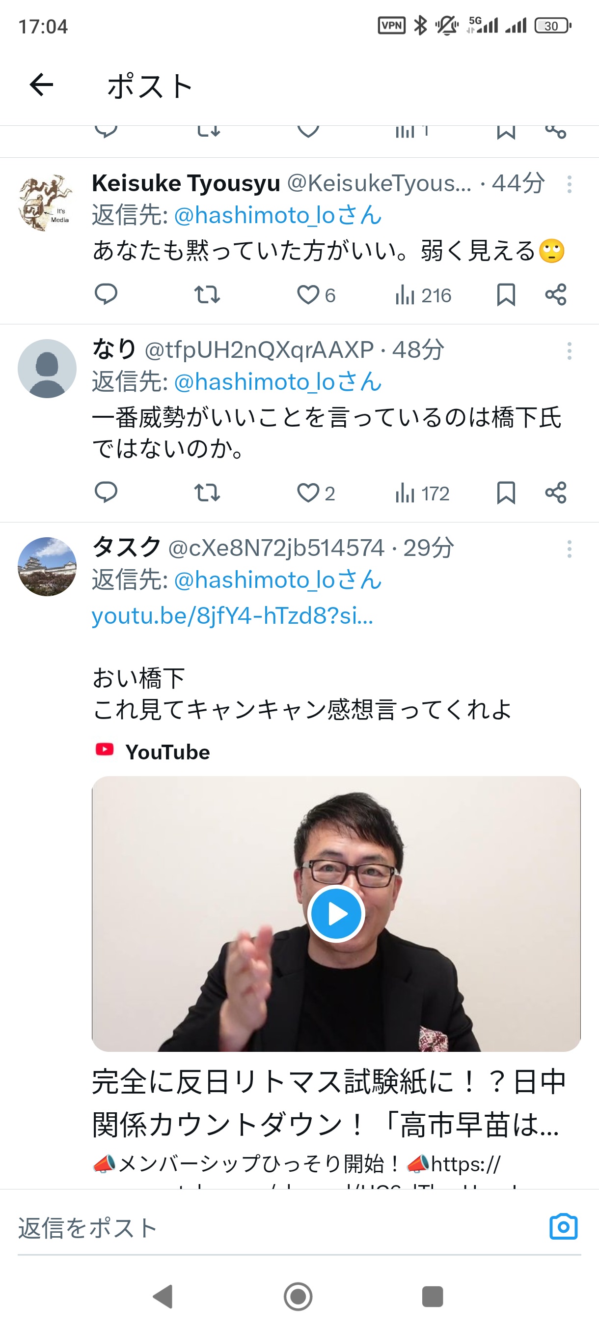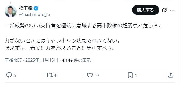 【炎上】橋下徹「(高市首相に)キャンキャン吠えるべきでない」 →炎上 2025/11/16 速報 https://alfalfalfa.com/articles/10969630.html 1: — (@hashimoto_lo) なおブチギレ document.write(” + ”); 関連記事 【悲報】橋下徹さん、牛丼の紅しょうがを山盛りにしてしまうwwwww 【悲報】橋下徹、「国旗損壊罪」に反対「刑事罰を与えるほどのことではない」 【悲報】橋下徹さん、自分が作った維新が与党入りして感無量wwwwwwwww 【悲報】橋下徹さん「特定の女性に露出した事実出てない…それだけだったら活動休止にする必要ないと思う」 ←草間リチャード敬太容疑者に私見 【悲報】橋下徹氏「僕はもっと外国人に来て貰いたいんですよ。島国日本で日本人ばっかりは居心地が悪い」 【画像】飲み会でちょっと離れた席に座ってる男を一撃で刈り取る女wwwwwwwwwwwwwwww document.write(” + ”); 続きを読む ——— Source: アルファルファモザイク 【炎上】橋下徹「(高市首相に)キャンキャン吠えるべきでない」 →炎上