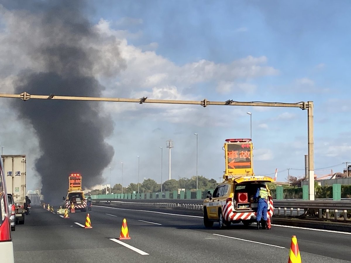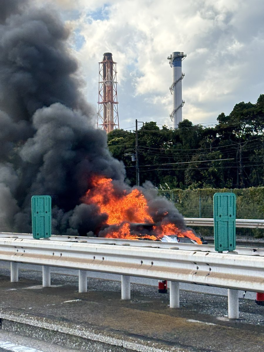 湾岸線上り、フェラーリ炎上のため通行止めになりそう。