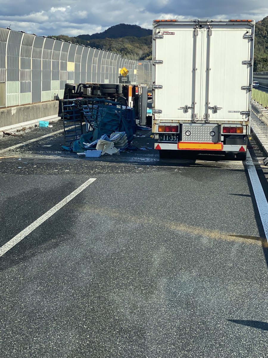 『山陽道上り 瀬戸PA5キロ手前でトラック横転してますよー 事故りたてだから渋滞になると思います 』