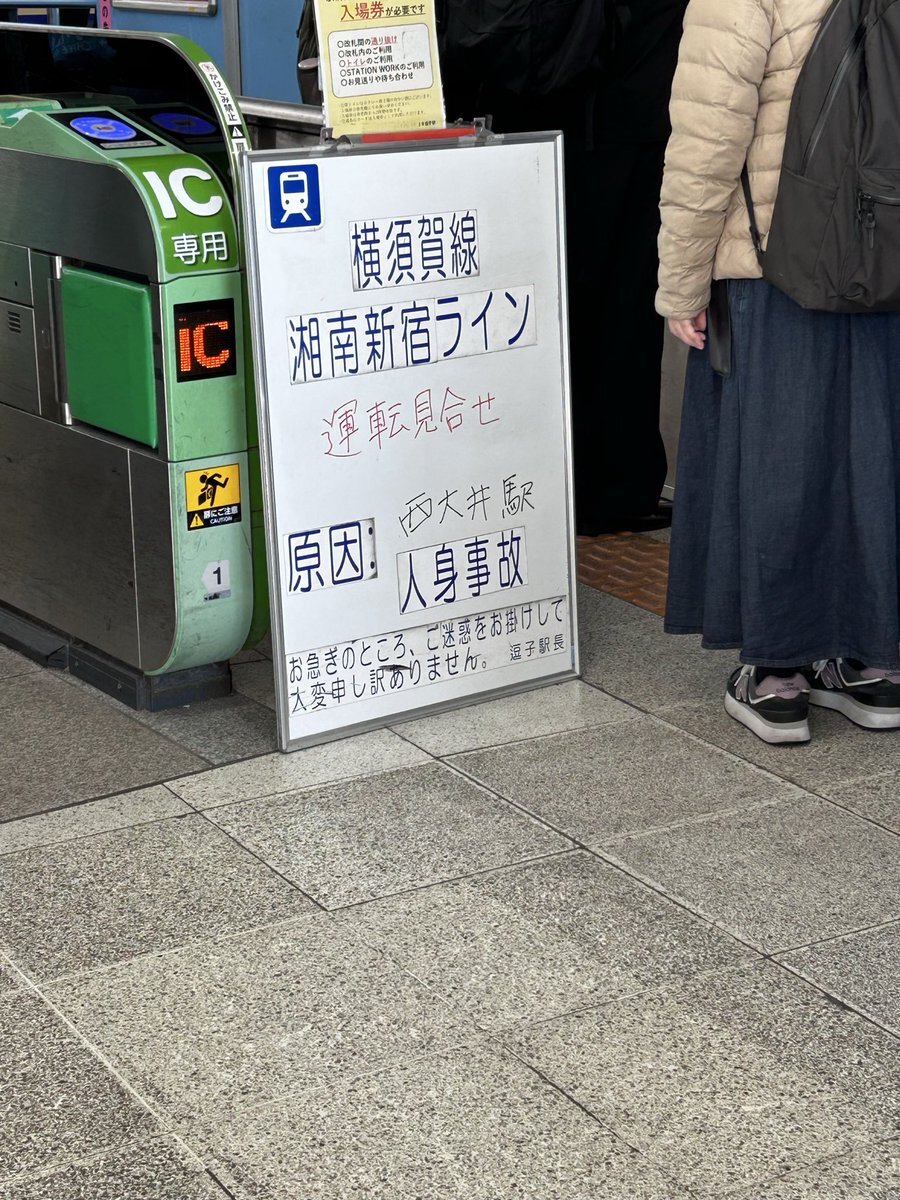 横須賀線は、西大井駅での人身事故の影響で、上下線で運転を見合わせています。運転再開は13時20分頃を見込んでいます。 #横須賀線 #Yokosuka_Line https://t.co/LojididwyV— JR東日本【東海道方面】運行情報 (公式) (@JRE_F_Tokaido) November 20, 2025