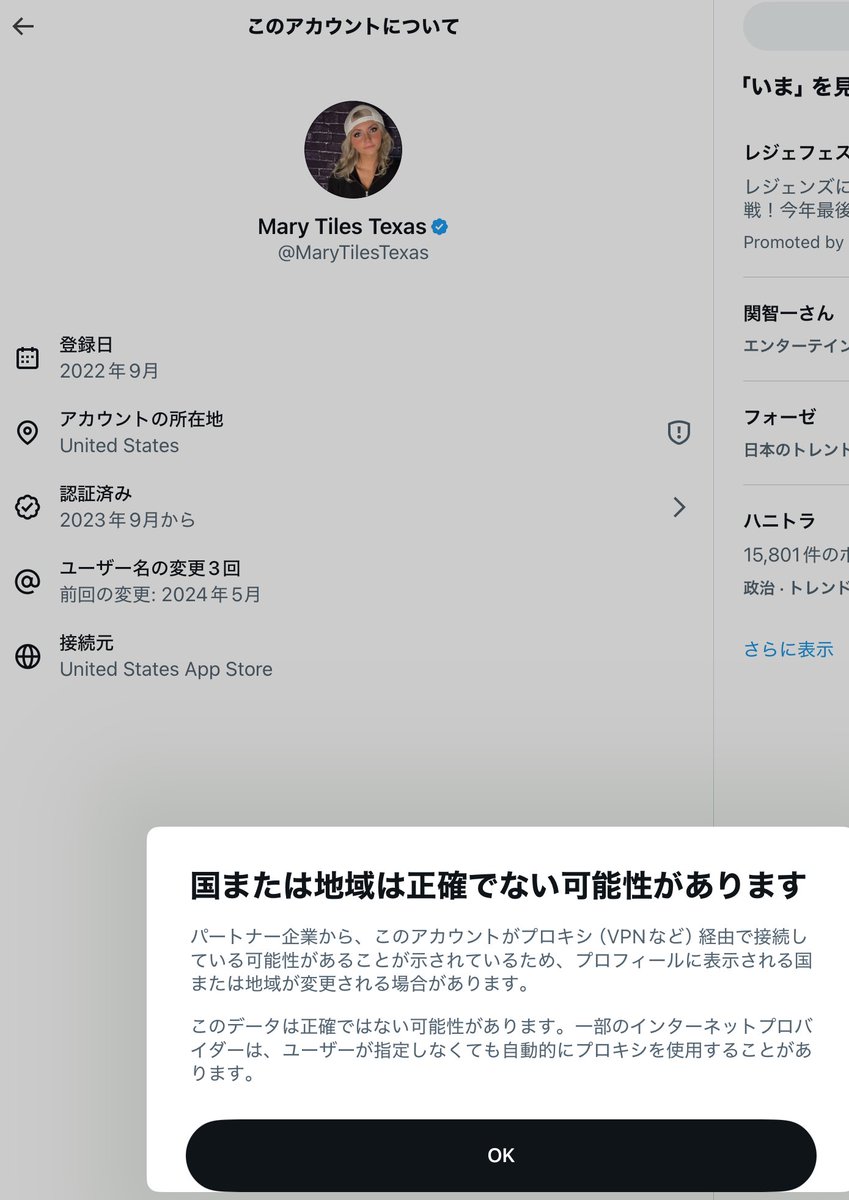 所在地表示には「!」マークが付き、VPNを使用している可能性があるアカウントも特定できるようになった。この機能により、スパムアカウントや偽アカウントの特定が容易になることが期待されている。