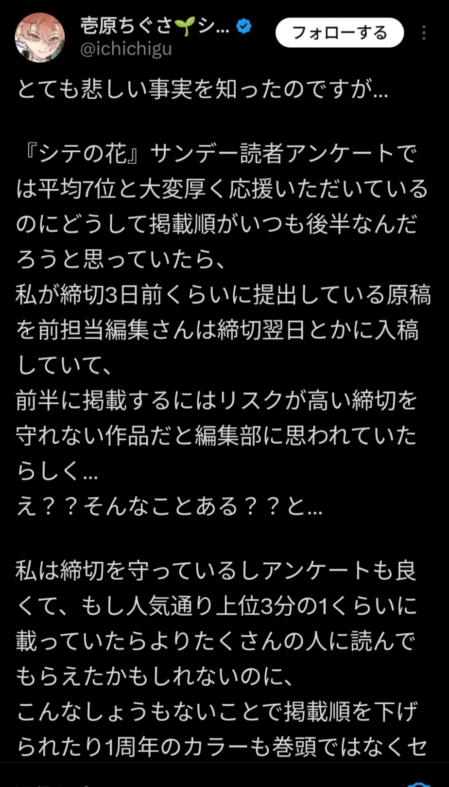 【悲報】小学館またやらかす。週刊サンデーの闇を告発した漫画家の作品が本誌連載終了。 2025/11/24 速報 https://alfalfalfa.com/articles/10972037.html 1: セクシー田中さんでやらかしてまたこれかよ! document.write(” + ”); 関連記事 【悲報】サンデー漫画家「締め切り守ってたのに前担当編集が締め切り後に入稿していて掲載順を下げられてた」 【炎上】サンデーモーニングに出演する青木理さん、「俺の子供の頃にずっと描いていた口裂け女のイメージが高市早苗なんですよ」と発言 【衝撃】TBS「サンデーモーニング」MC交代で回を追うごとに視聴率低下中wwww 【悲報】東山降板の『サンデーLIVE!!』、ジャニーズ性加害問題スルーで炎上 【究極画像】週刊少年サンデー、僕ヤバみたいな新連載が始まる 【動画】岡田紗佳さん、刺激が強すぎるwwwwwwwwwwwwwwwwwwwwwww document.write(” + ”); 続きを読む ——— Source: アルファルファモザイク 【悲報】小学館またやらかす。週刊サンデーの闇を告発した漫画家の作品が本誌連載終了。