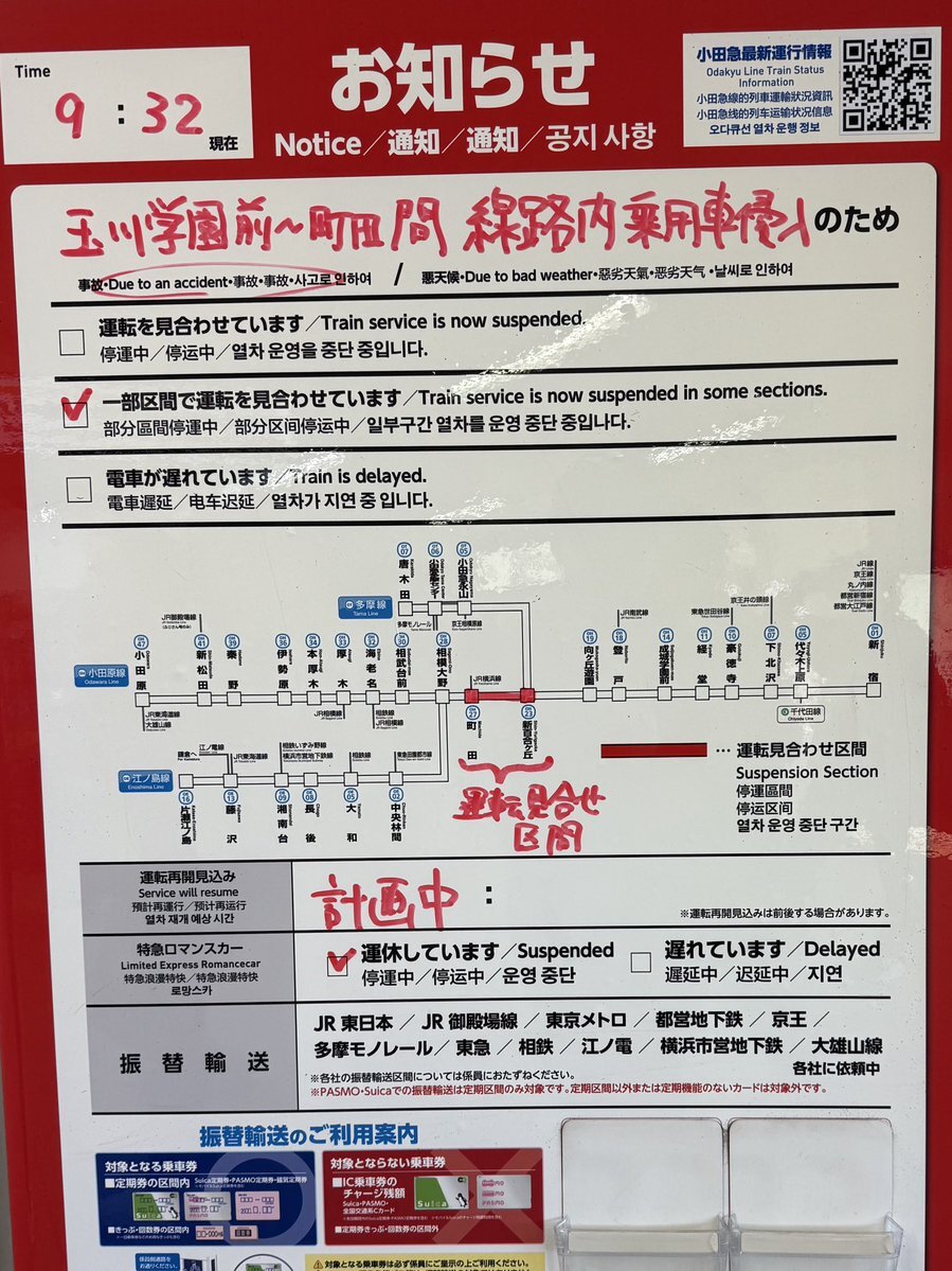 【小田急小田原線】09:20頃、玉川学園前〜町田駅間で発生した線路支障の影響で、新百合ケ丘〜町田駅間の運転を見合わせててぴえん🥺 振替輸送を行ってる pic.twitter.com/xHTOa5ATUi