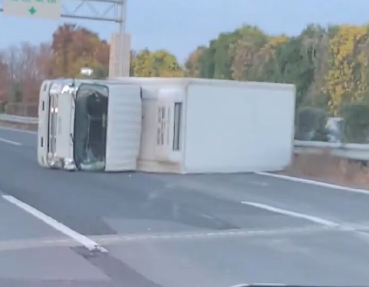 『関越道下り上里SA2キロ手前で2車線跨いでトラック横転してるんだが、