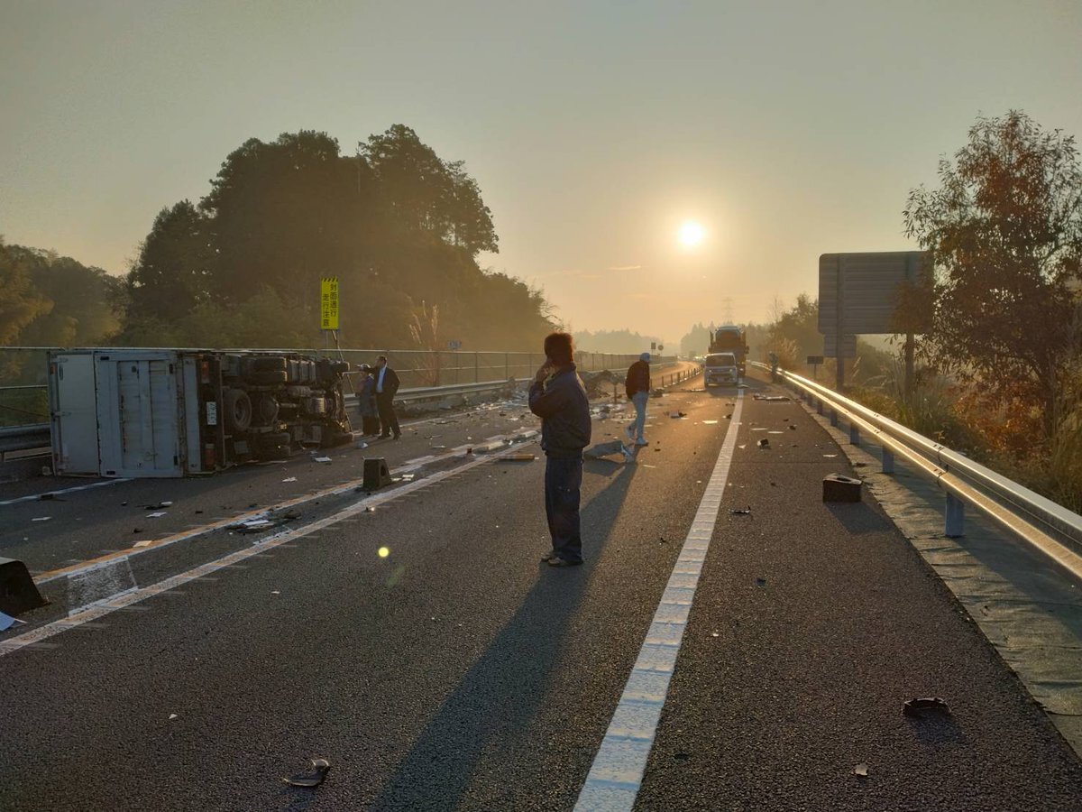 【現場の状況】#交通情報 圏央道 稲敷IC~稲敷東IC付近 広範囲に破片散乱するトラック乗用車の多重事故で通行止め渋滞11月28日 #圏央道 #茨城 #稲敷
