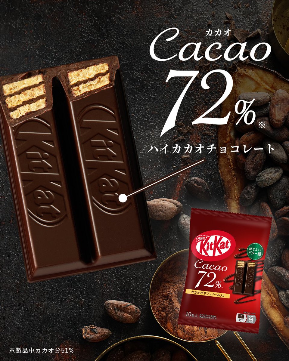 キットカットの「カカオ 72% 10枚」と「鉄分補給 with ミロ 10枚」はいずれも希望小売価格が777円から1015円へと引き上がる。値上げは25年3月以来1年ぶり。