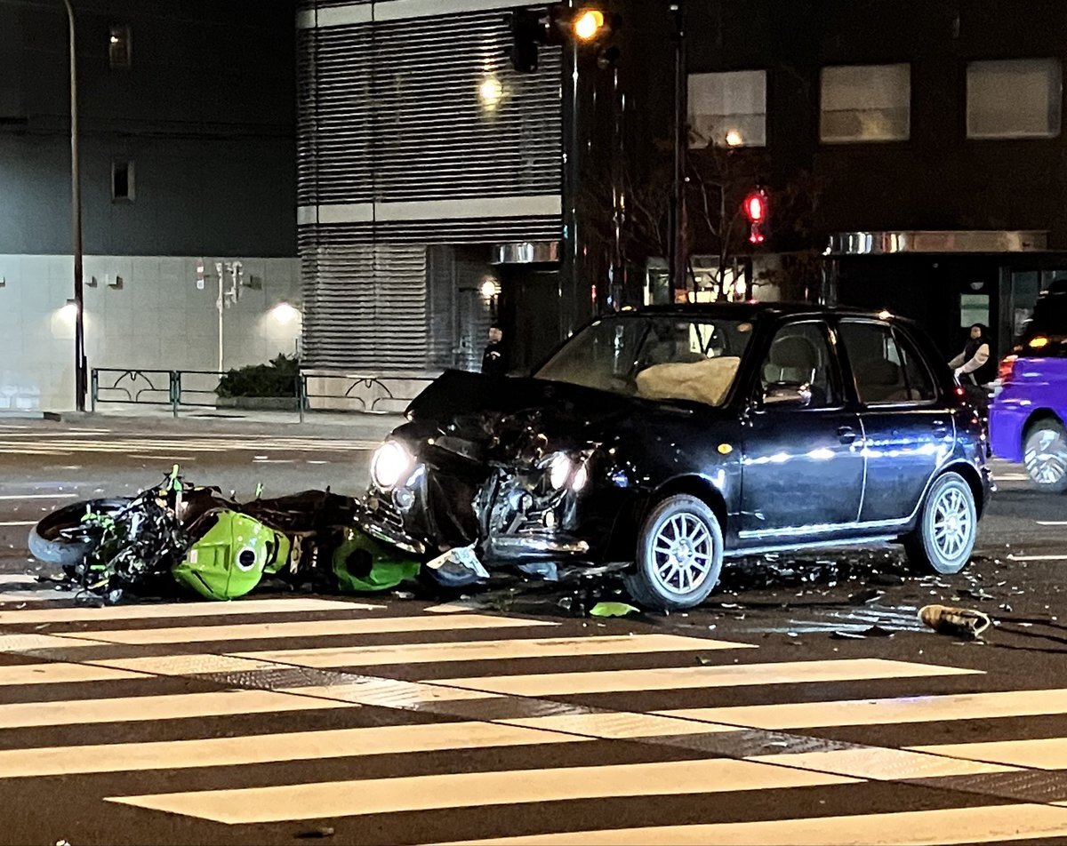 『蔵前一丁目バイクと車の事故バイク大破でオイル漏れてる😱😱』