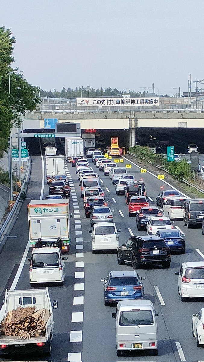 『大和トンネルで車の追突にバイクが突っ込んだような事故があったんだけど、レッカーと救急案件っぽいから、この後渋滞長くなりそう。』