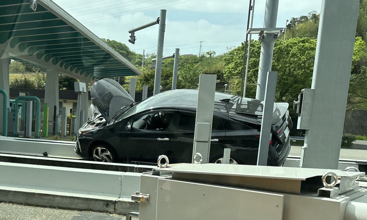 『横浜横須賀道路の横須賀料金所のETC.専用レーンにプリウスが乗り上げ横転してる😱😱いったい何事?』