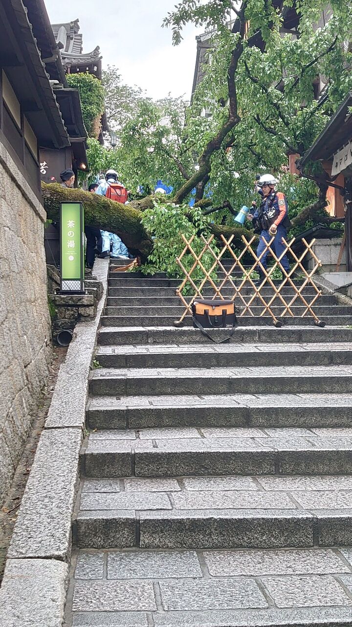『清水寺事故ってる。パトカー、救急、消防が七味屋さんのあたりに。三年坂の桜が折れて倒れてるっぼくて封鎖されています。』
