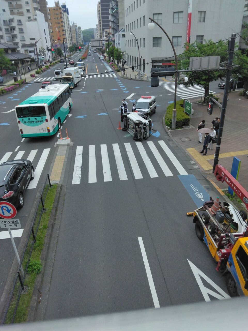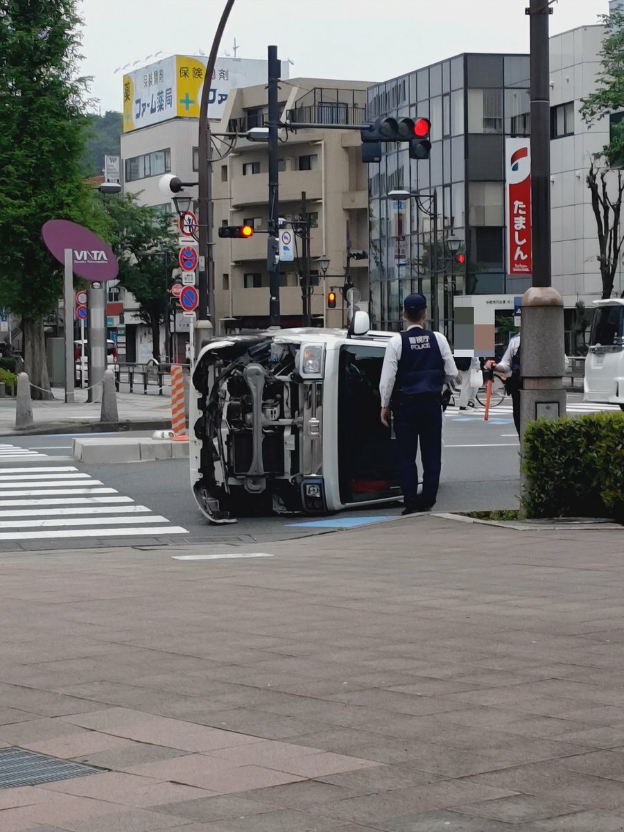 『聖蹟桜ヶ丘の駅の交番の真ん前で車が横転してる。前の方はぐしゃぐしゃ。